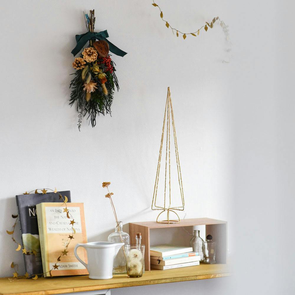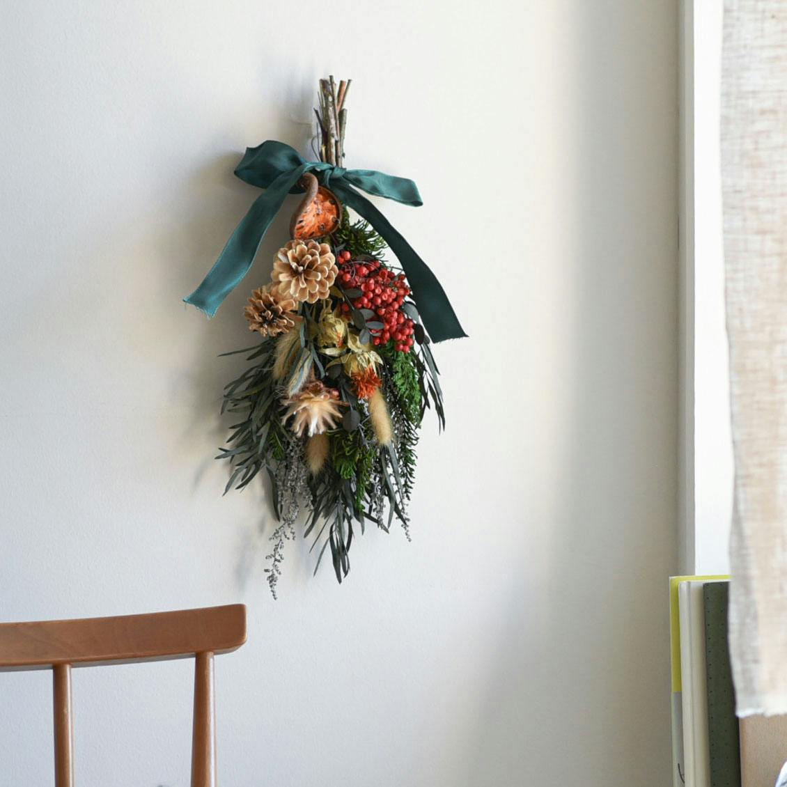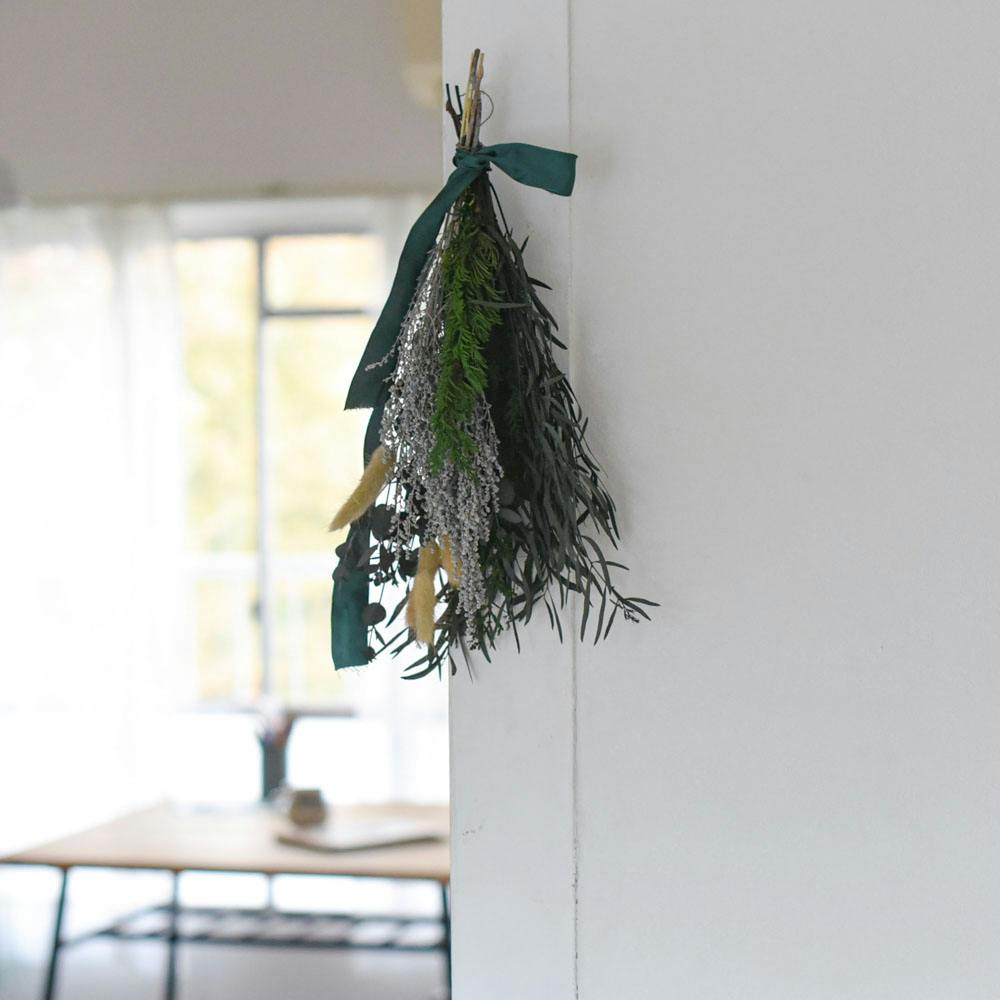 お好みで花材を束ねてリボンで巻くだけ。壁のインテリアが華やいで、クリスマスが待ち遠しくなります。