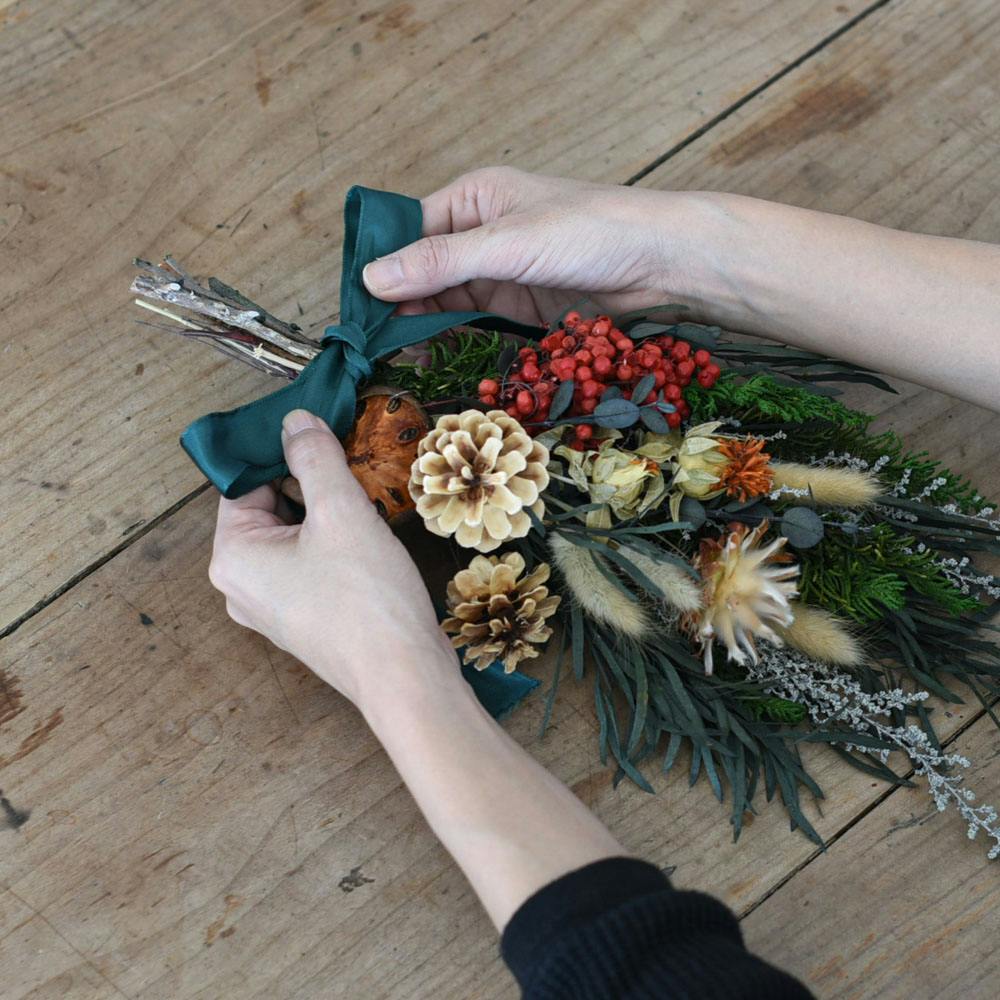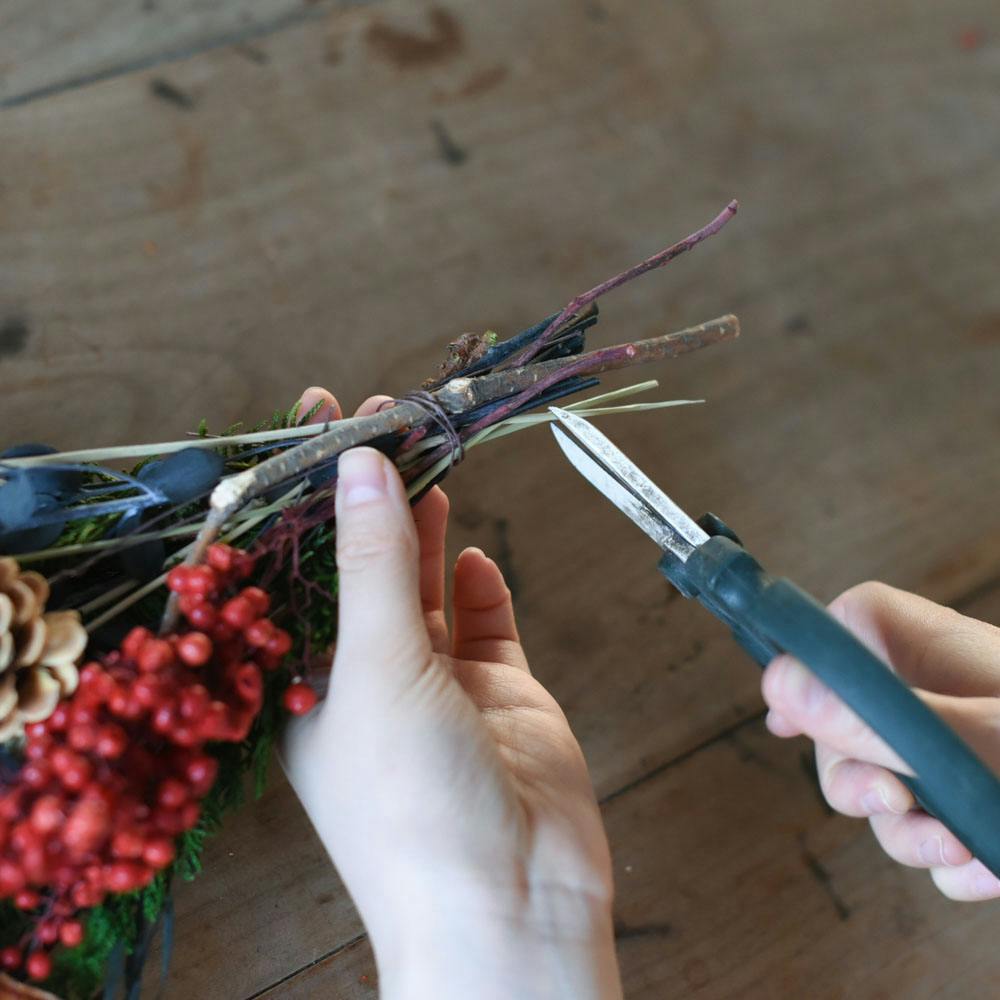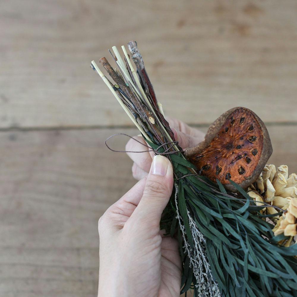 松かさやべールナッツに付けたワイヤーが見えないようにしたり、グリーンを手前にも重ねたりと、お好みのバランスで作ってください。花材はすべて使わなくてもOKです。