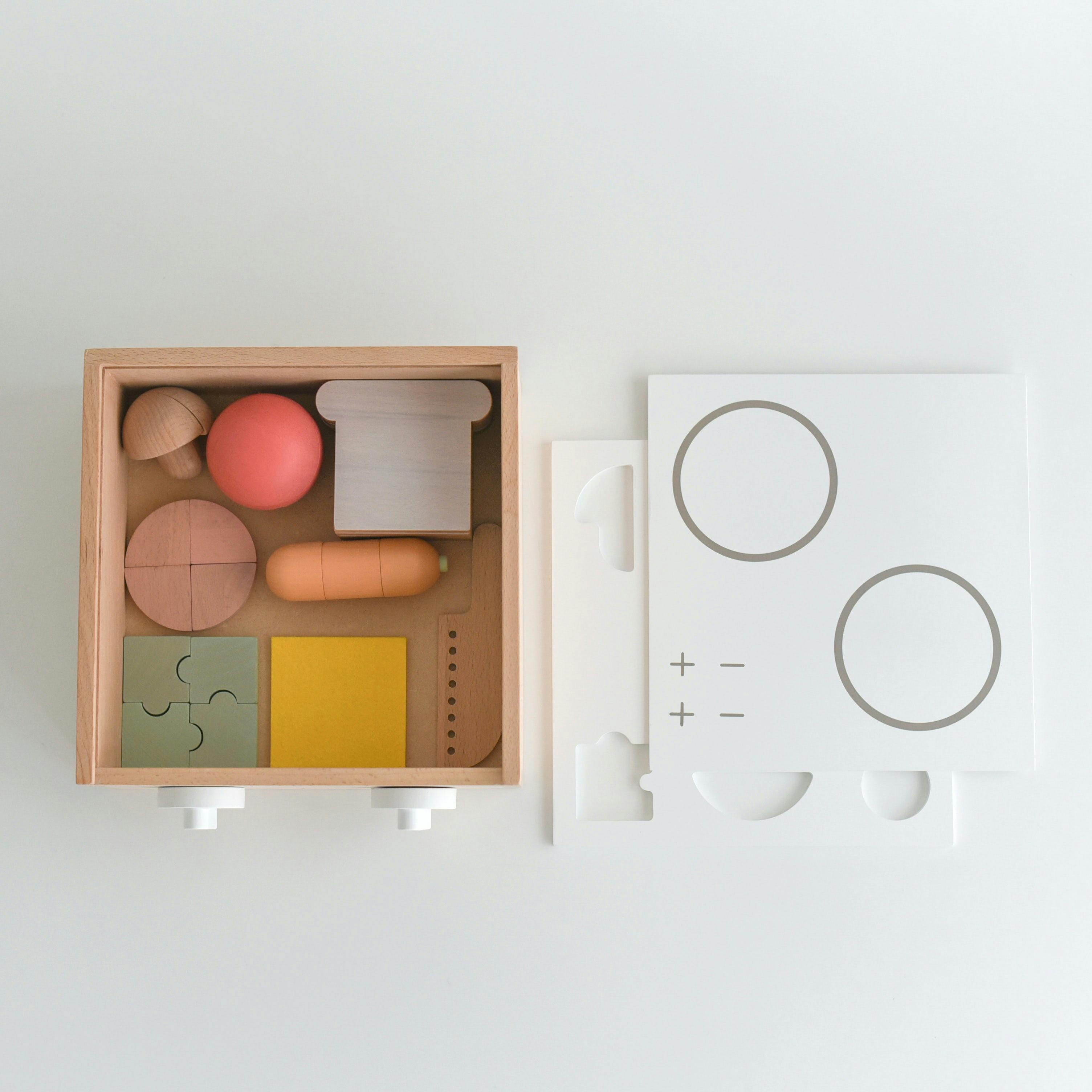 コンロ型のシンプルな箱の中に、食パンやトマト、チーズなど7種の食べ物と、包丁のおもちゃが入っています。