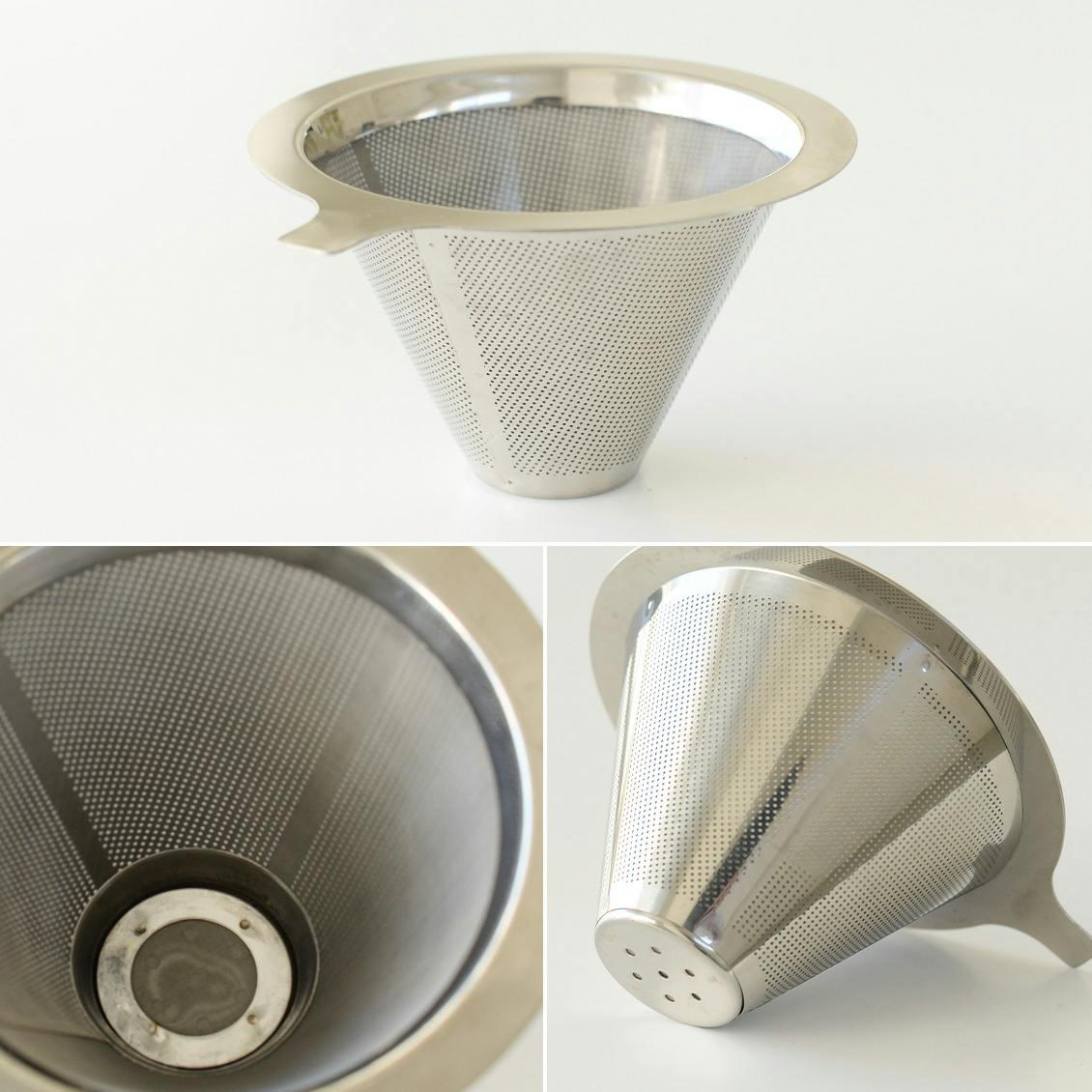 セットのフィルターは、内側と外側で穴の大きさが違う二重メッシュ構造の、ダブルステンレスフィルター。ここに直接コーヒーの粉を入れてお湯を注ぐだけなので、ペーパーフィルターは不要です。