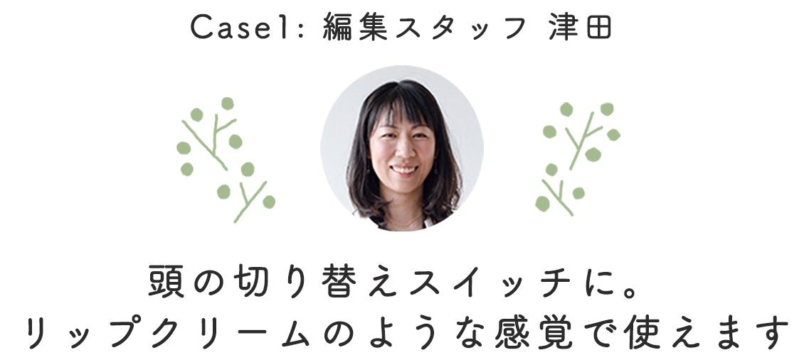 「出かけるときはポーチへ、リモートワークの日はデスクに常備。その場でさっと使えるので、リップクリームのような感覚で、気がついたら手首やこめかみに塗っています。