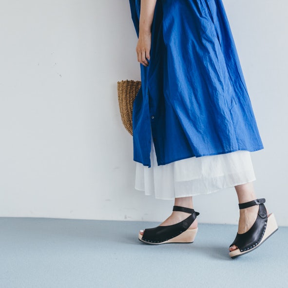 肉厚のレザーを用いたフォームは、足に優しくフィット。木製のソールも素足に気持ちよく、まるで無垢材のフローリングの上を歩いているよう。一度はくと虜になってしまいます。