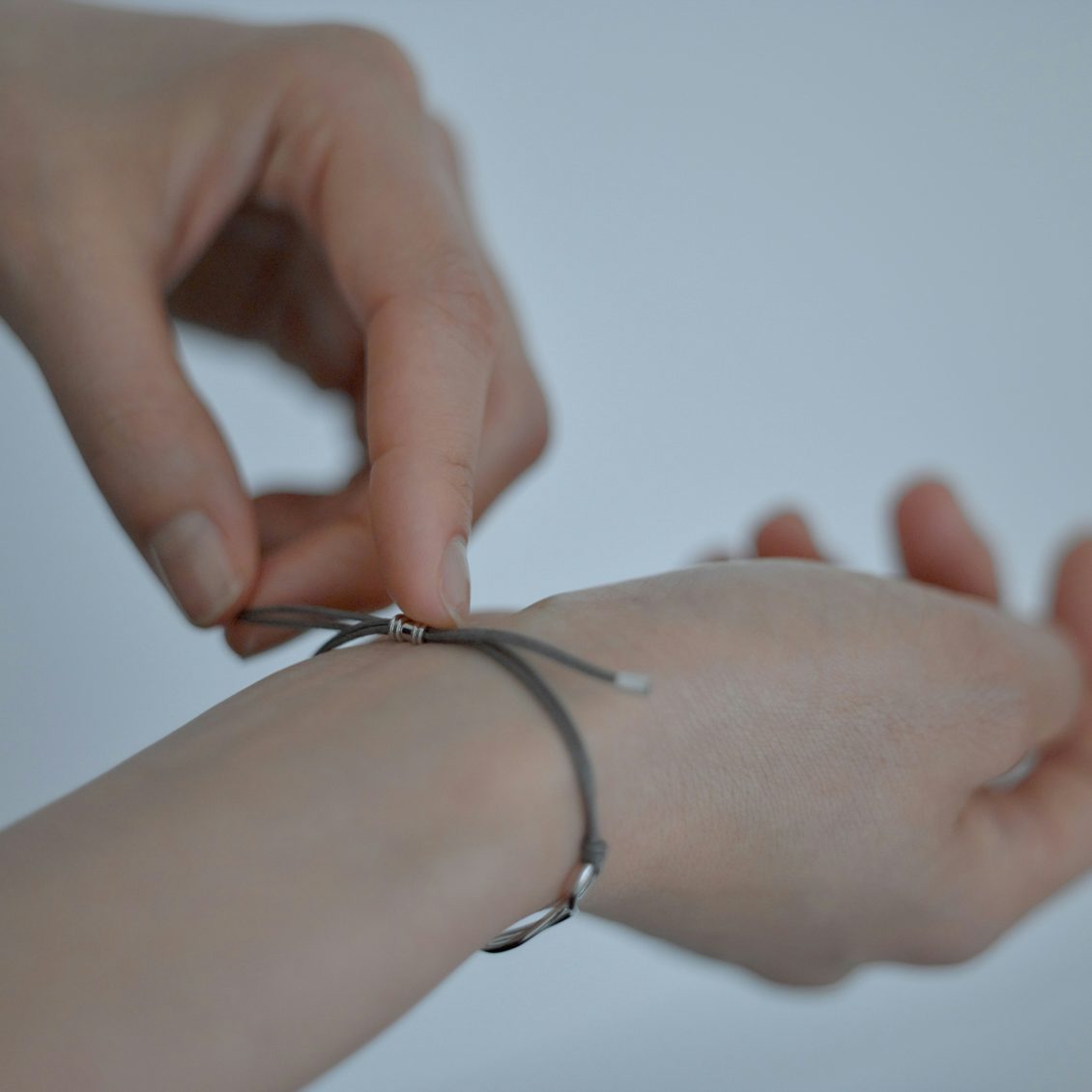 手首の内側部分のみ、グレーの紐(ワックスコード)にしたのはつけ心地の観点から。