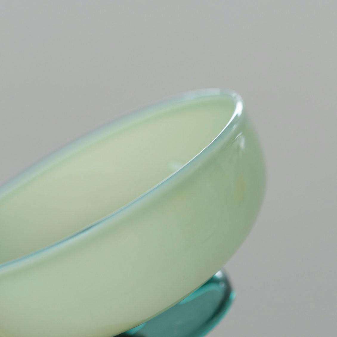 縁の色は、光の角度によって見え方が変わるのも素敵なんです。このミルキーなガラスにキュンとします。