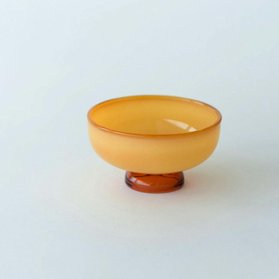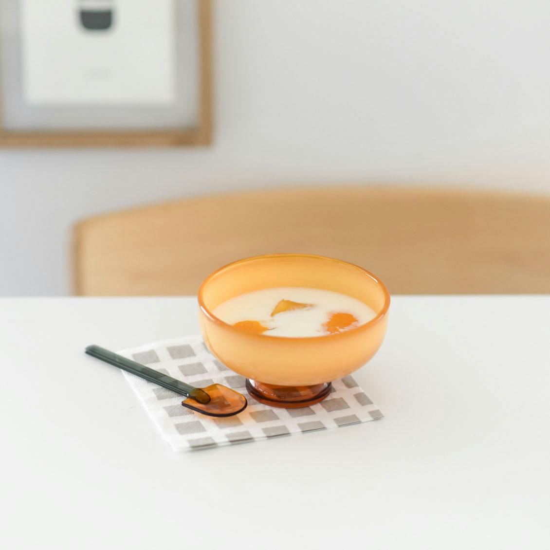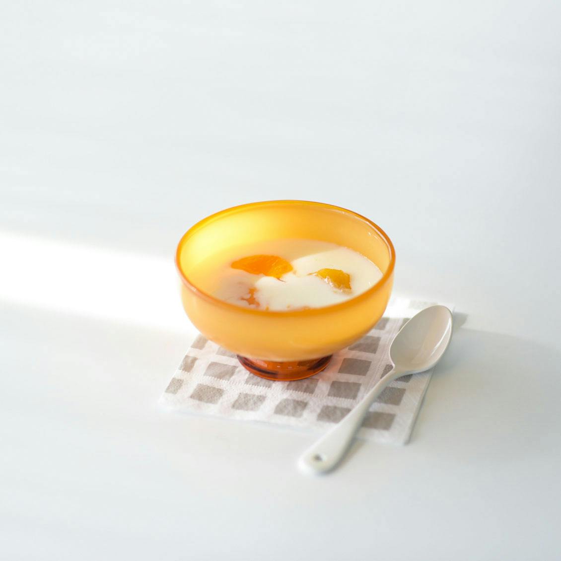 今回ご紹介する器は、乳白色のガラスで作られたデザートボウル。かわいい高台つきで、レトロな雰囲気がとびきり可愛くみせてくれます。