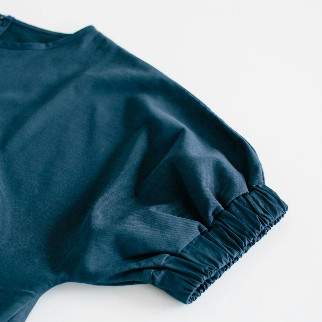 肩から腕をふんわりと包み込むやや長めのパフスリーブで、二の腕が細くみえるあしらいに。