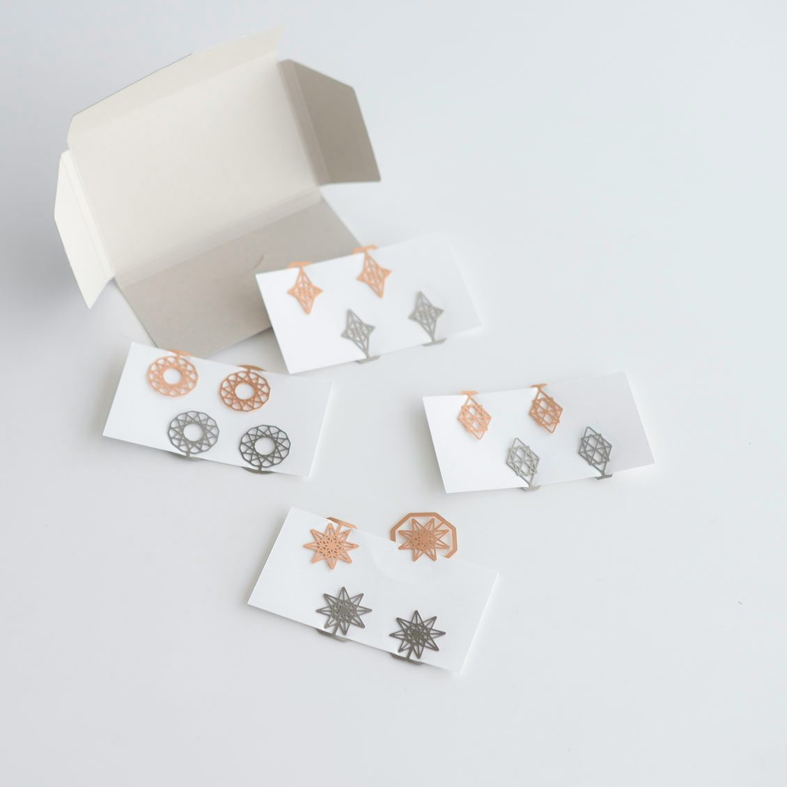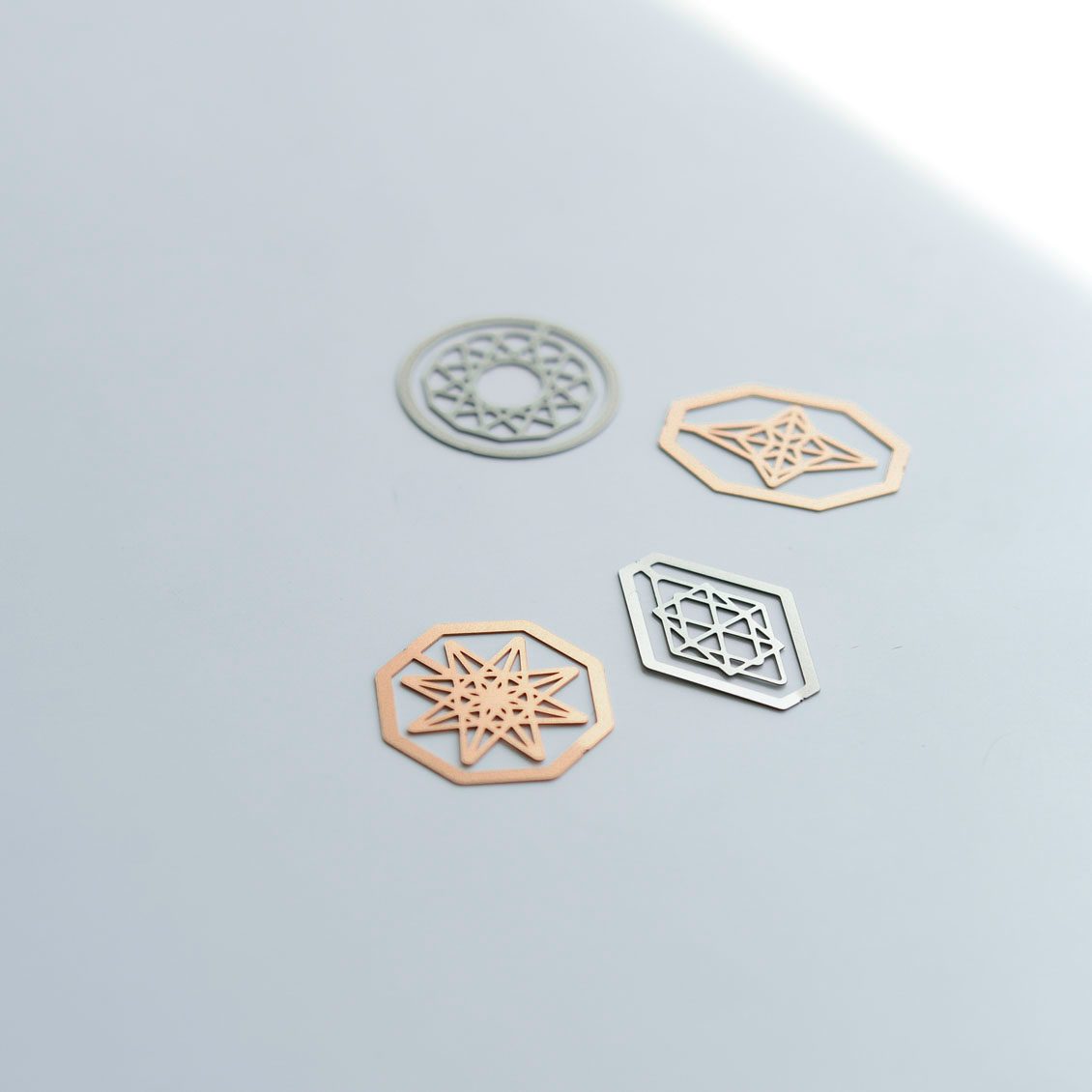できあがったのは、4種類。いずれも、エッチング(版画)加工ならではの繊細な幾何学模様で、大人になじむデザインです。