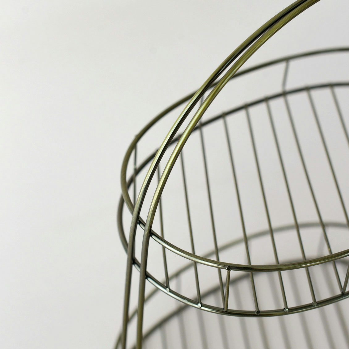 ワイヤーで出来たバスケットは、まるい持ち手付きで、その特徴的な形とアイアンの素材は存在感があり、空間のなかで絵になる佇まいです。