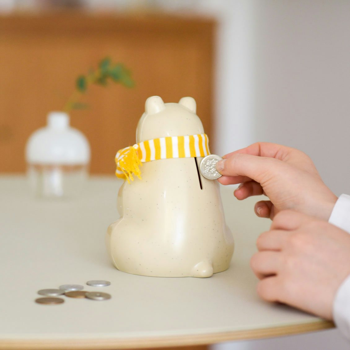 当店で大人気、そしてロングセラーアイテムの「白くま貯金箱」。今年はイエローのマフラー付きです。
