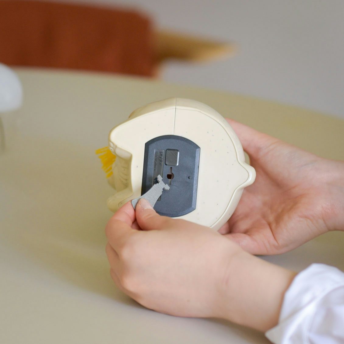 この貯金箱が子どもたちへプレゼントされていた当時、カギは銀行に預けておき、貯金箱が一杯になったら銀行で開けてもらっていたのだそう。