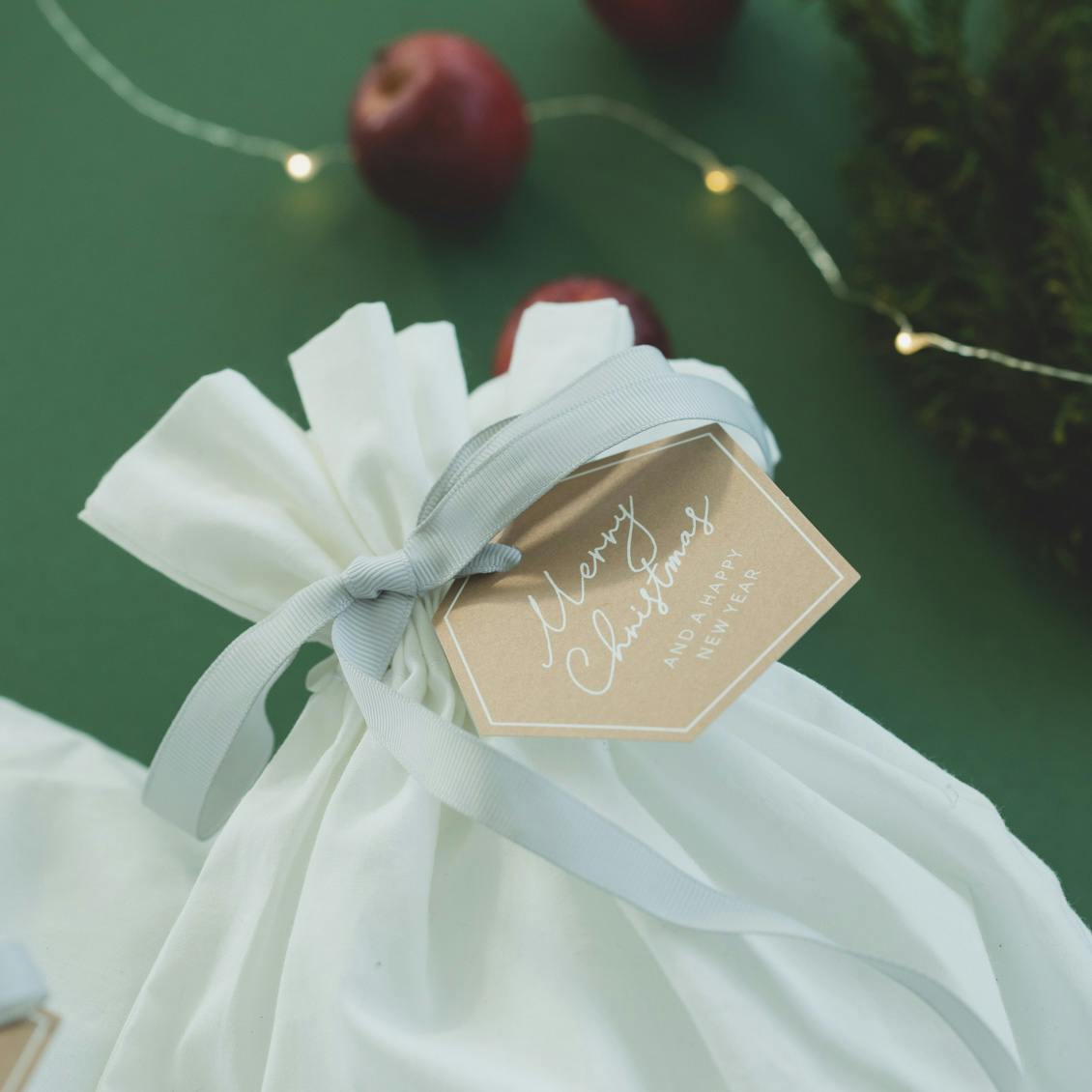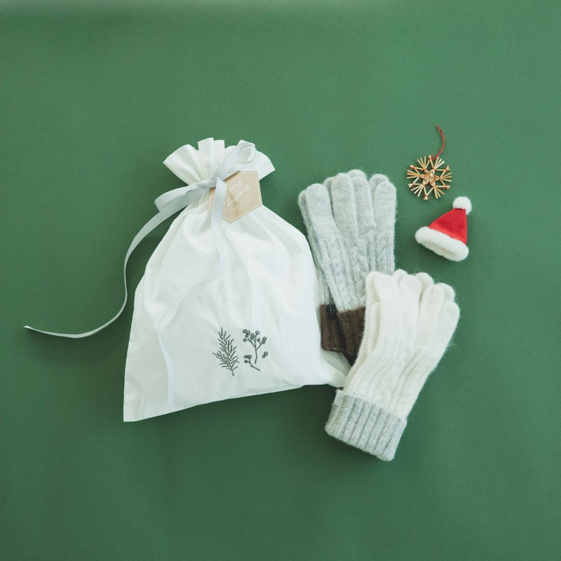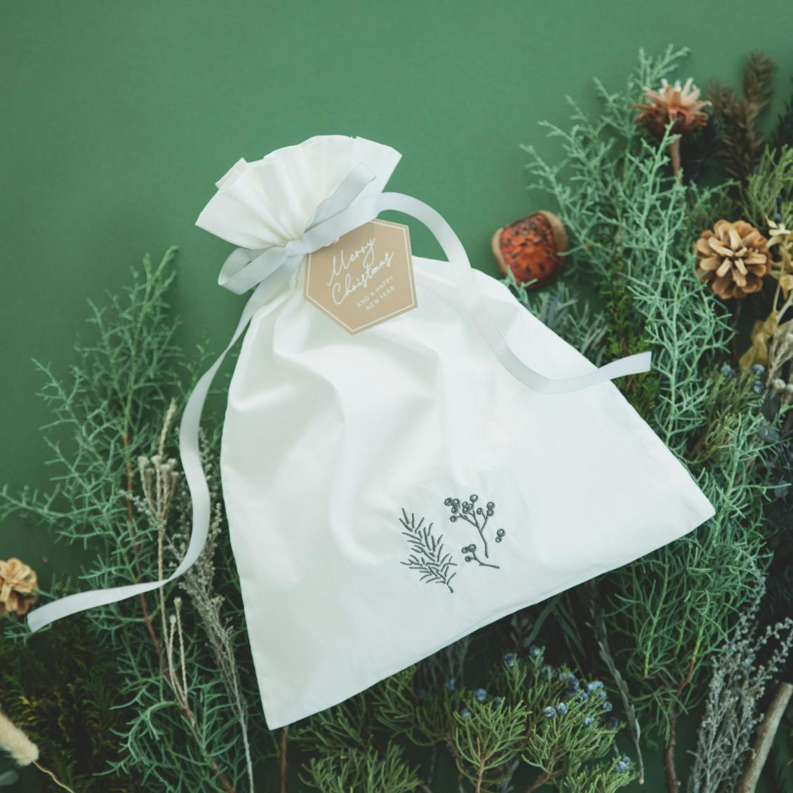 大切なプレゼントを包むのは、まるで雪のように中身をふわっと包みこむ、柔らかなコットン素材のバックです。