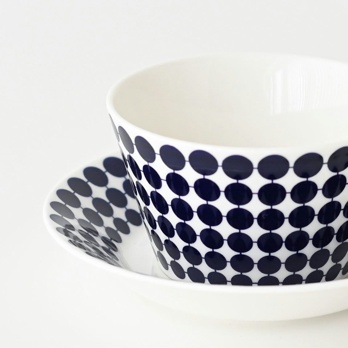 上から下へ大きさが変化するブルーのドット模様で構成されたデザインは、数ある北欧食器の中でも特にシャープでスッキリとした佇まいです。