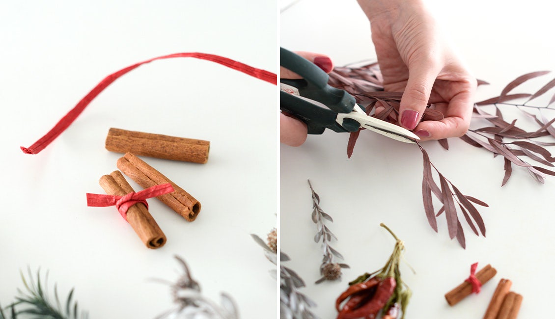 花材を小さめの房に切り分け、シナモンにラフィアリボンを巻きます。