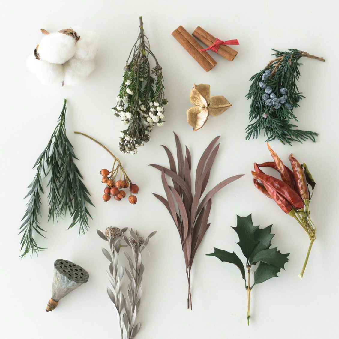 | 素材 | 花材:ユーカリニコリ、ティーツリー、ソフトヒイラギ、ブべッセンス、マウンテンジュニパー、フィリカエリコ、シナモンスティック、ワタカラ、トウガラシ、バラの実、ハスノミ、コットンフラワー その他の同梱物:ワイヤー、ラフィアリボン、カード パッケージ:ボール紙 |