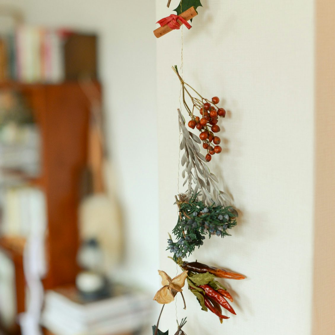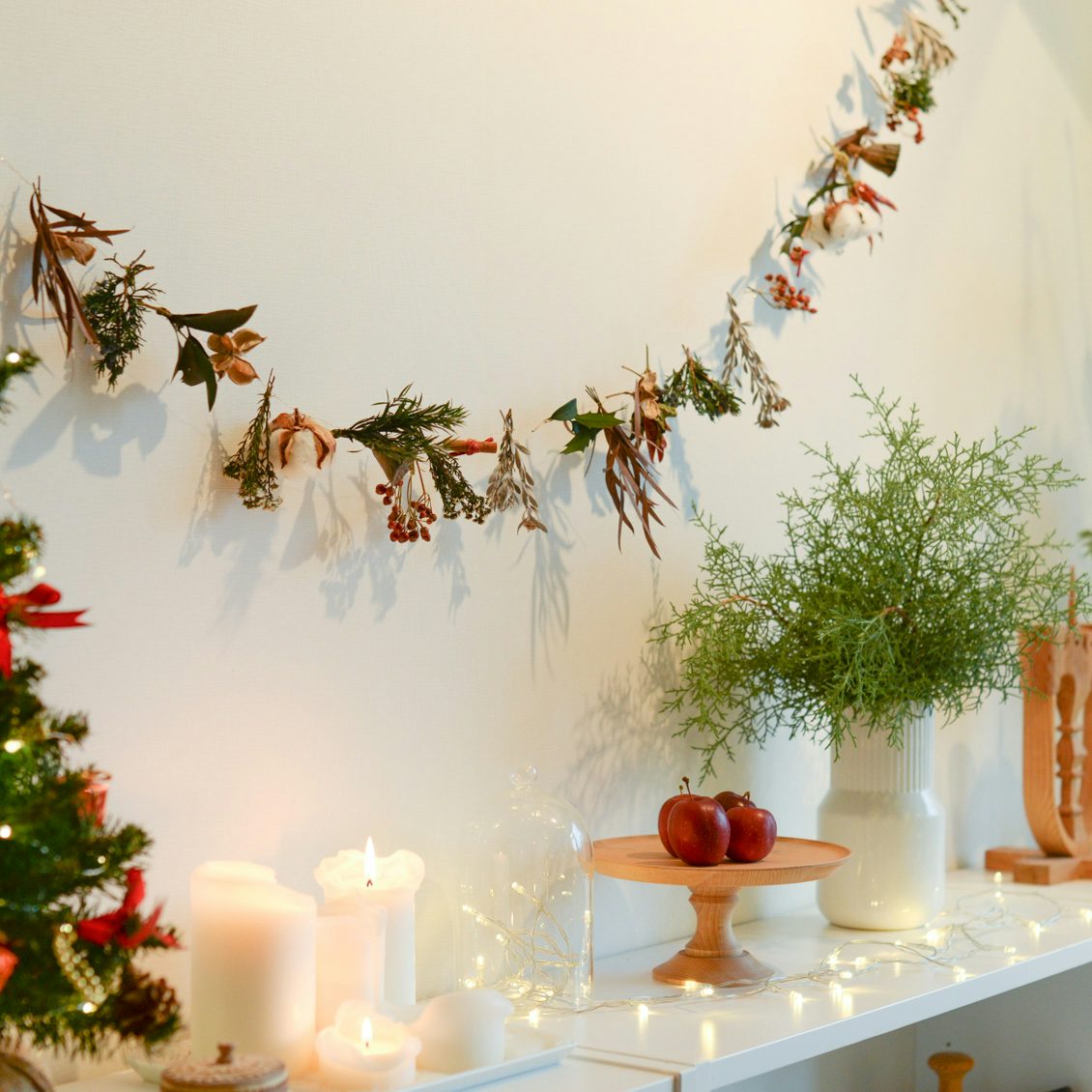 飾る場所やインテリアの雰囲気によってはクリスマスっぽさが気になる場合もあるかと思いますが、そんな時は赤い色のみ省いてみてください。グリーンがメインのシンプルなガーランドになり、長い期間かざっていただけると思います。