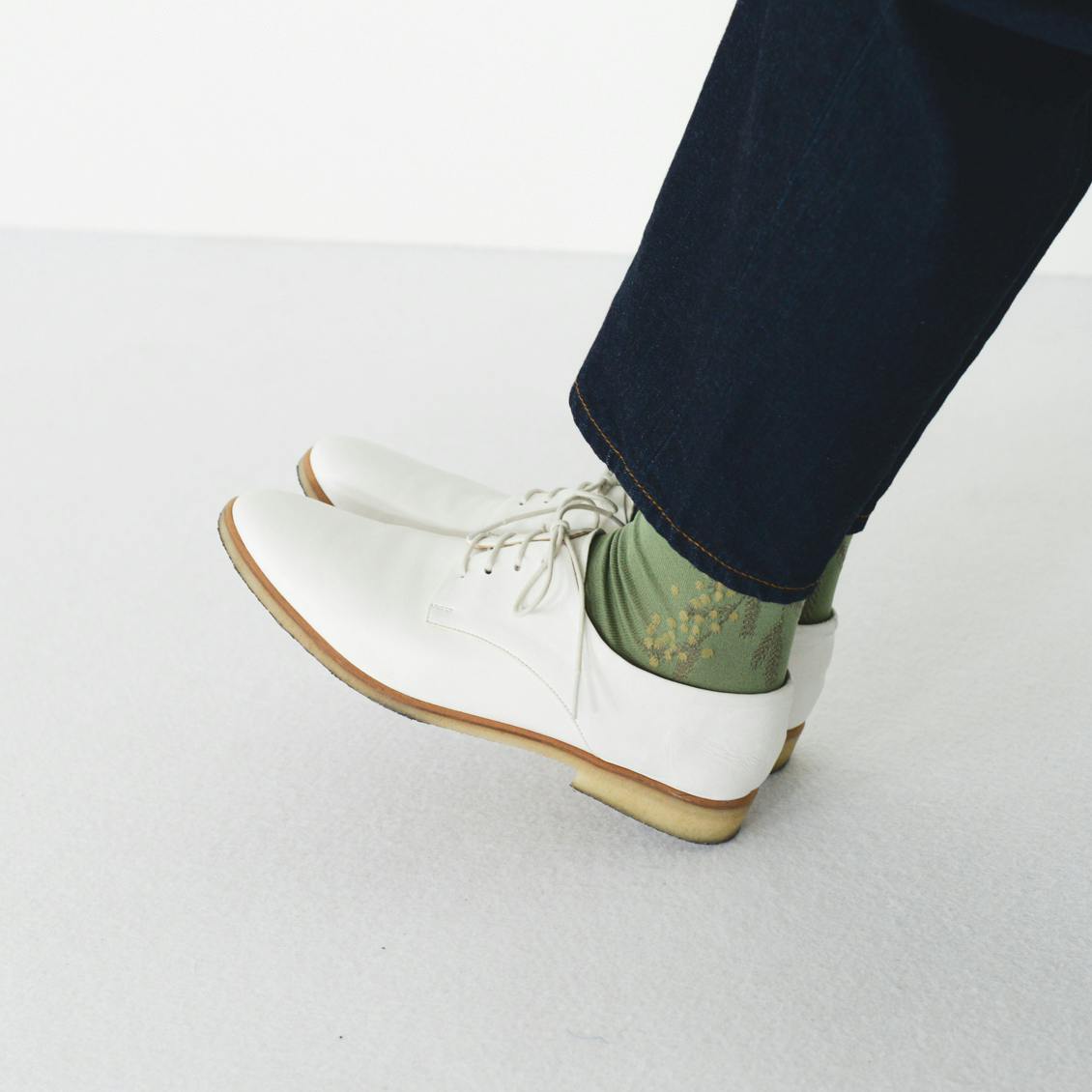 ミモザの絵柄はかかと側にだけ施しました。無地にみえる正面から向きをかえると、さりげなくミモザがあらわれる控えめなデザインです。