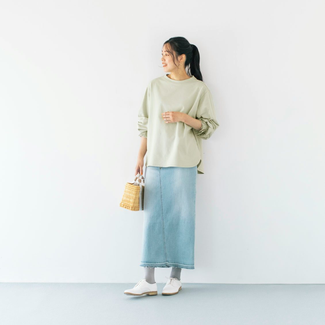 柔らかなくすみグリーンなので、きっと取り入れやすいはず。デニムやベージュ系ボトムスと相性抜群です。
