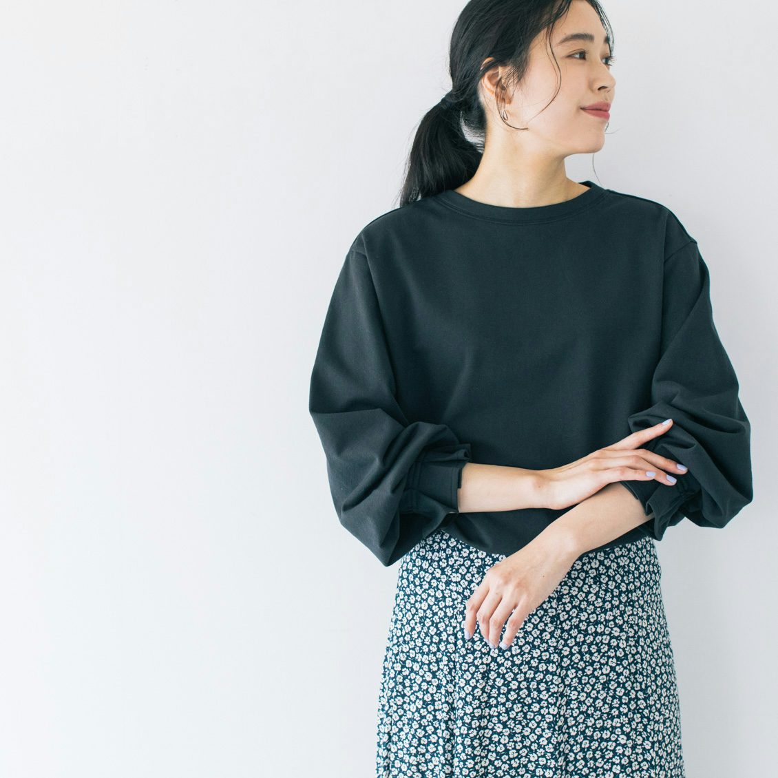 袖をたくし上げたときのボリューム感がとても可愛いのも、このトップスならでは。