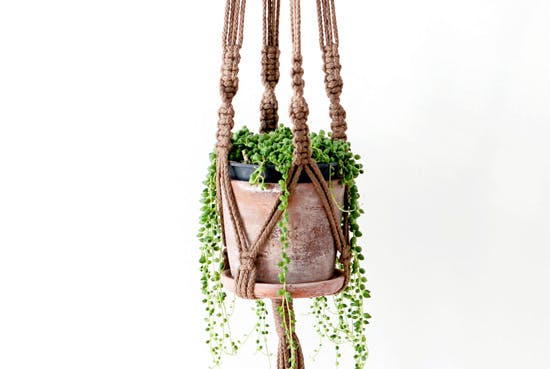 マクラメという名称でおなじみのアイテムで、天井や壁に取り付けたフックなどにヒョイと吊り下げて使うものです。