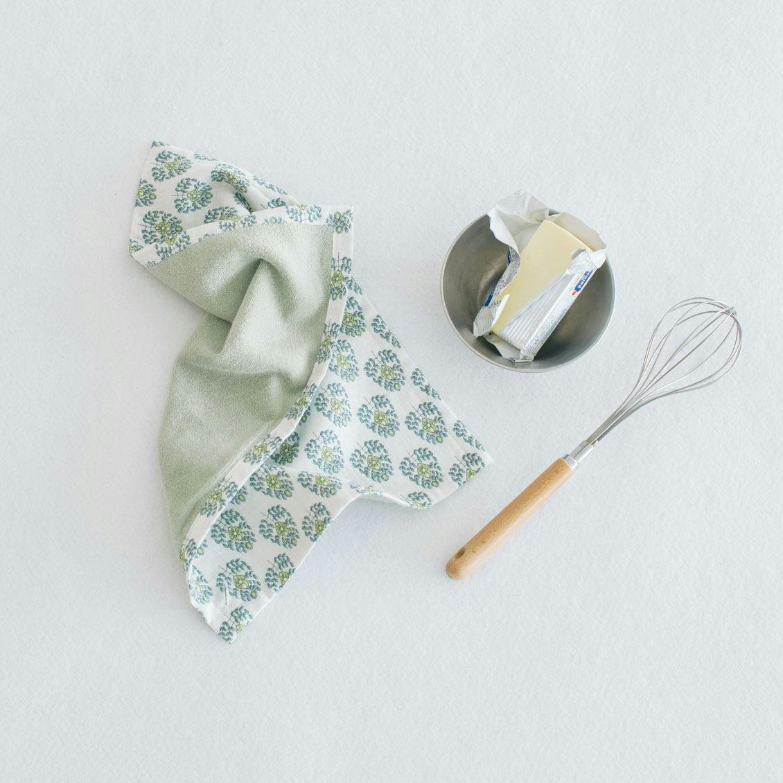 エプロンと同じ柄のふきんも作りました。裏地に吸収性のいいパイル地を採用。