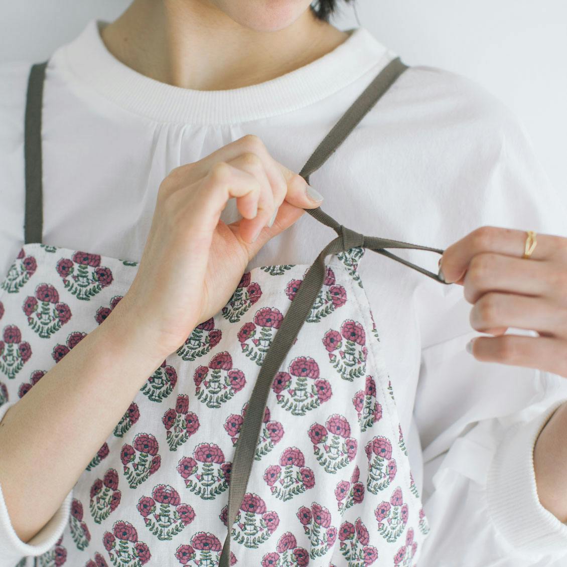 リラックスしたいときは後ろでゆったり結ぶと、エプロン下の服ともかさばりません。