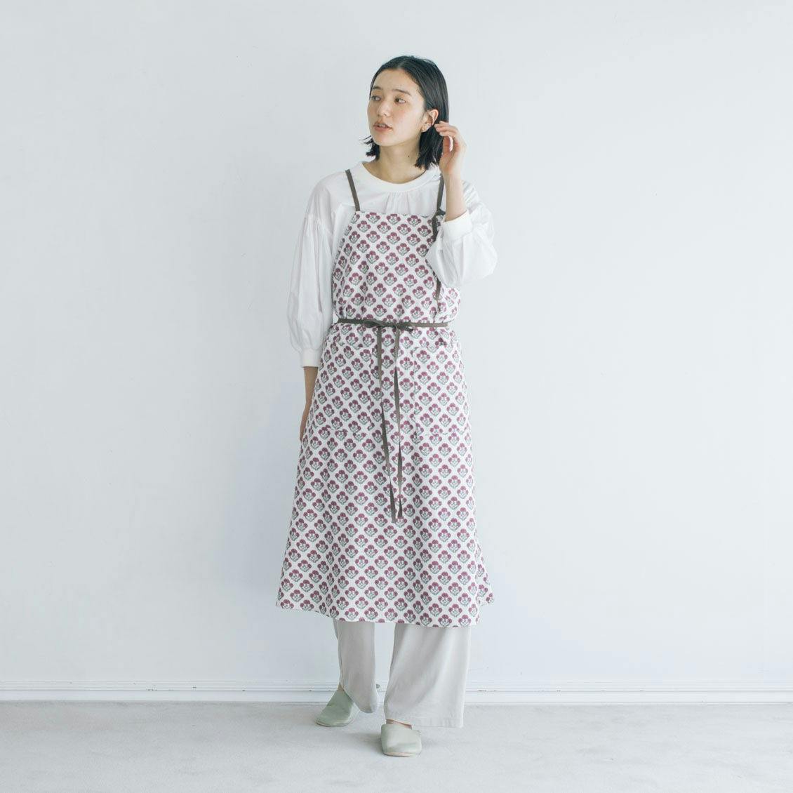 そう思って、このエプロンワンピースを選びました。心ときめく色柄と後ろ姿まで素敵なシルエット。着たままでも心地よい、ごきげんな一着です。