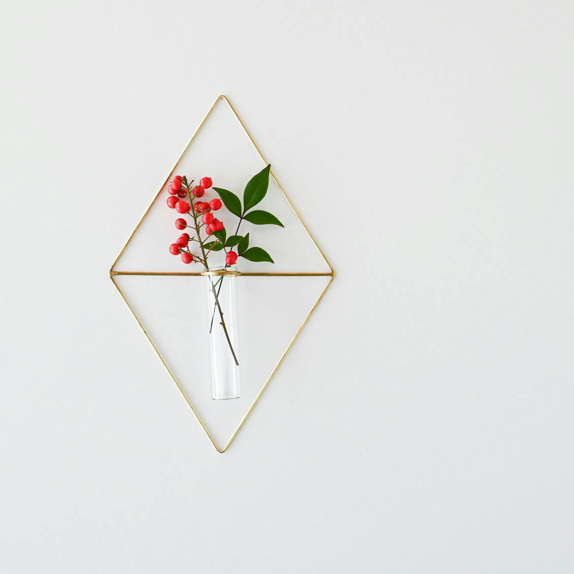 取り付けは市販の細いピン1本でOK。アイテム自体がオブジェのような見た目だから、好みのお花を一輪生けるだけでパッと華やかな壁面に。