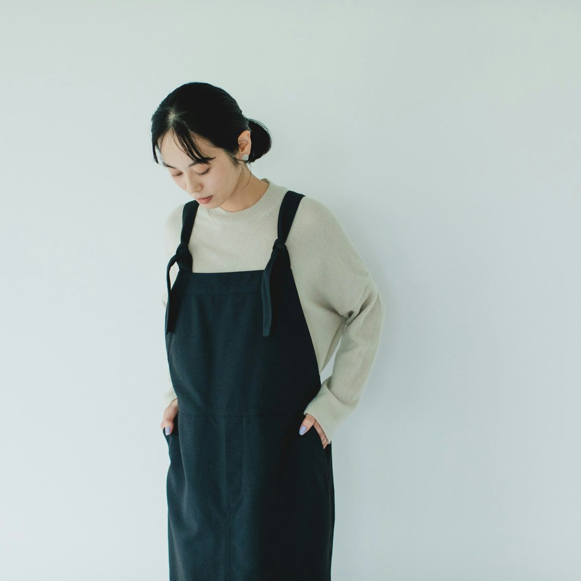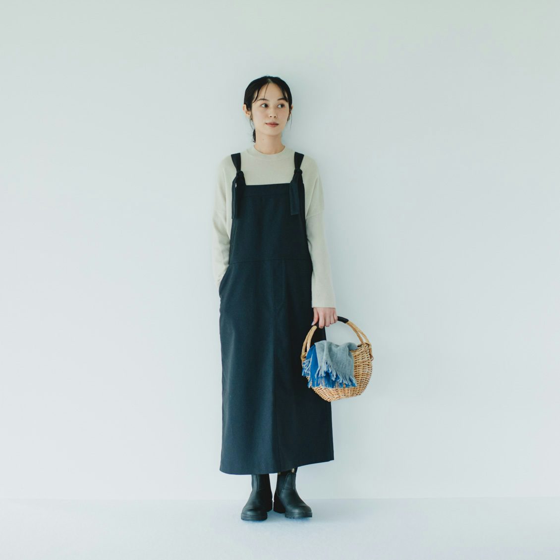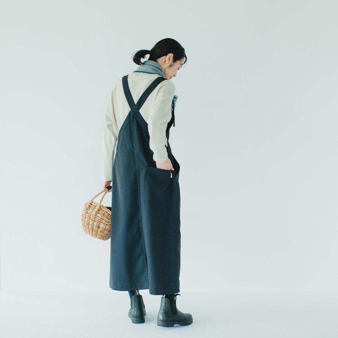 いわゆるサロペットというと、カジュアルで楽ちんな洋服という印象が強いものですが、これはしっかりとした「おしゃれ着」の印象。
