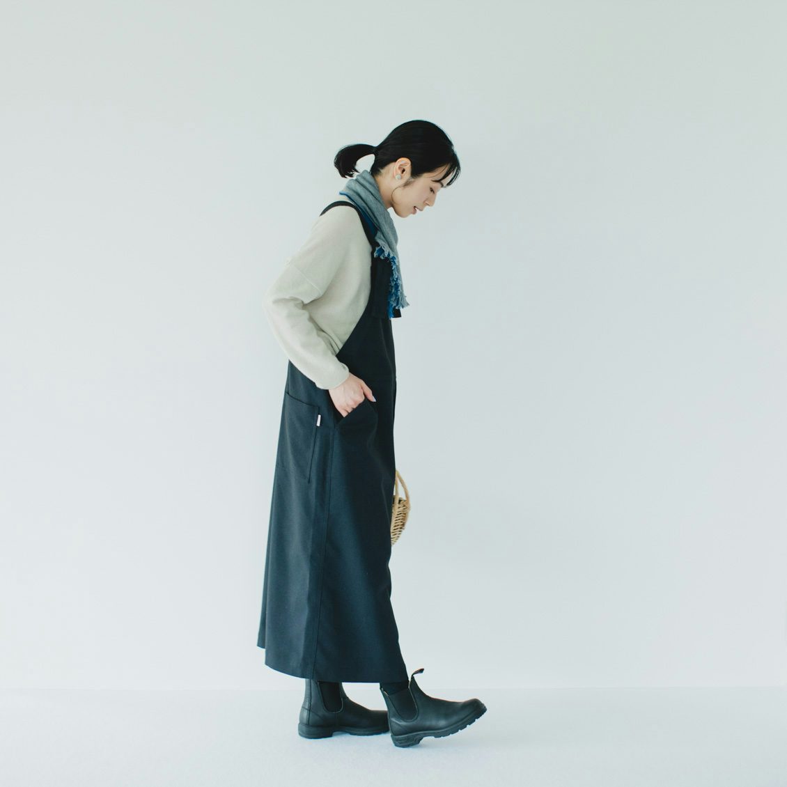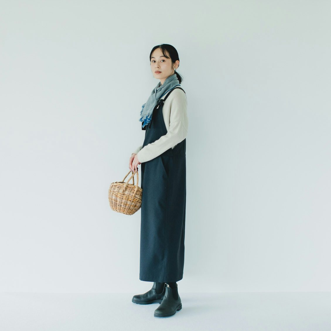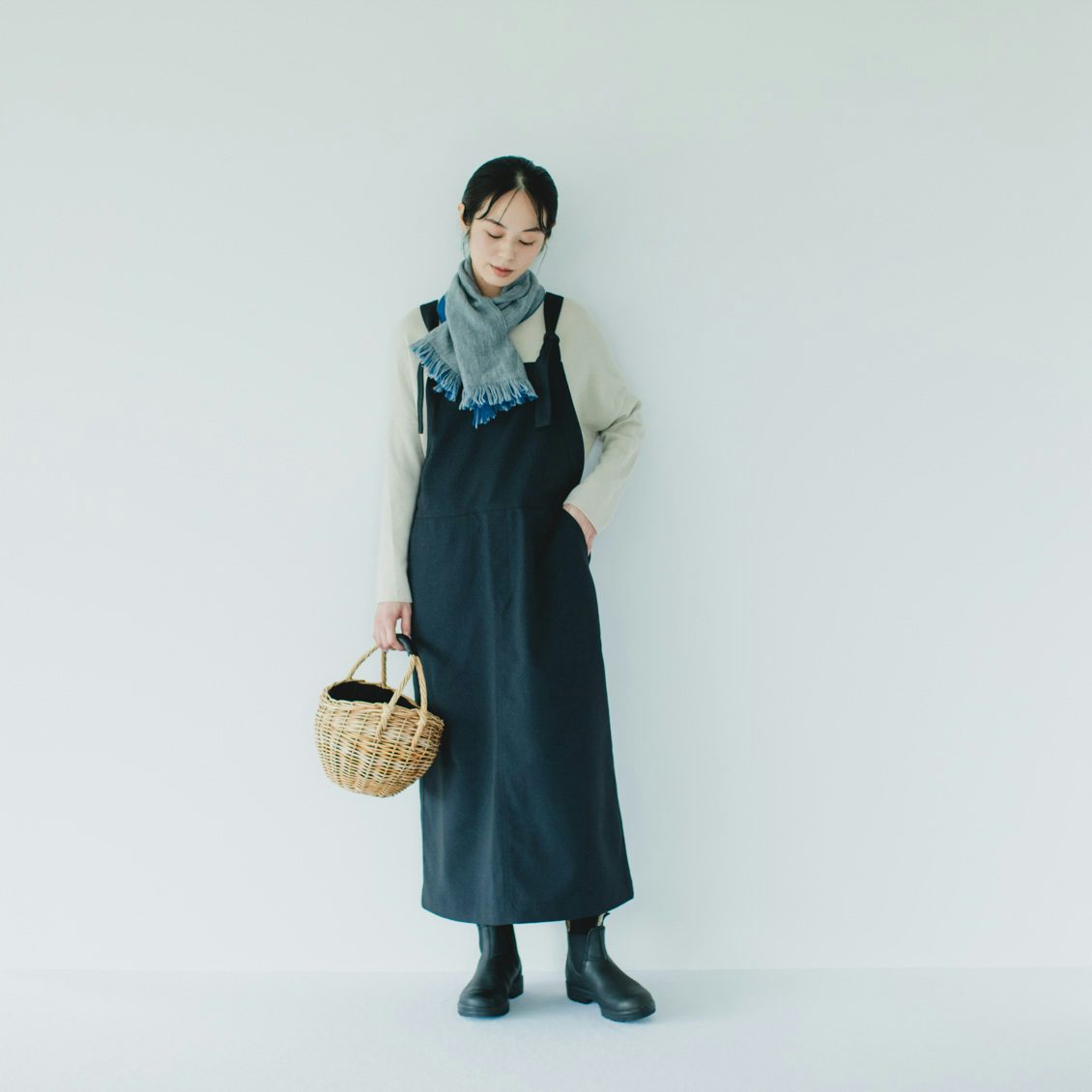 マフラーやカゴバッグなど、暖かみのある冬小物を合わるのも、季節の変わり目のお楽しみ。