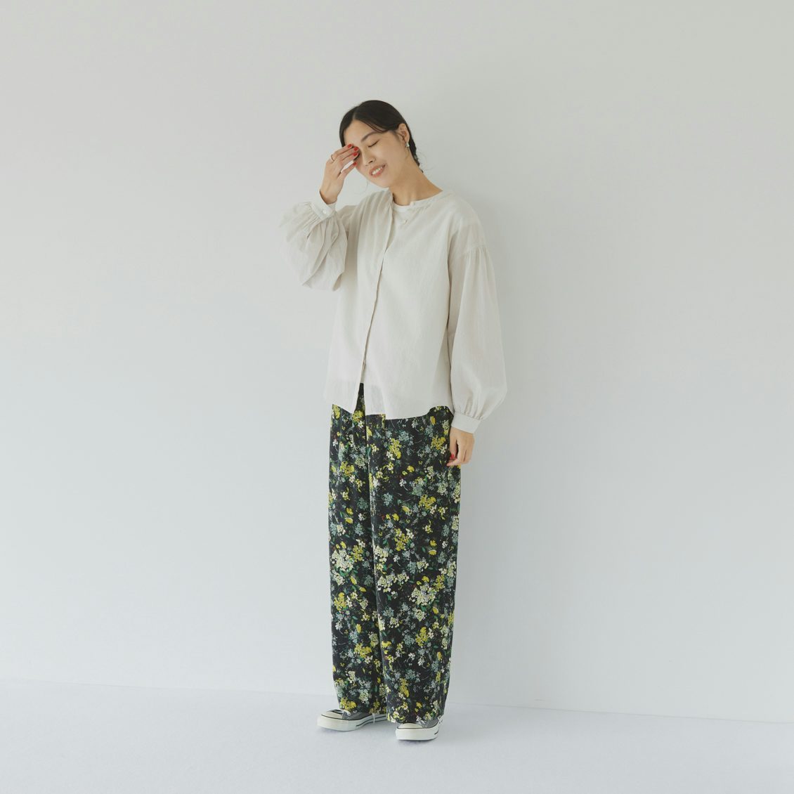 ふんわりボリュームのあるブラウスに、すっきりしたストレートボトムスを合わせれば、カジュアルながら上品な印象にまとめてくれます。
