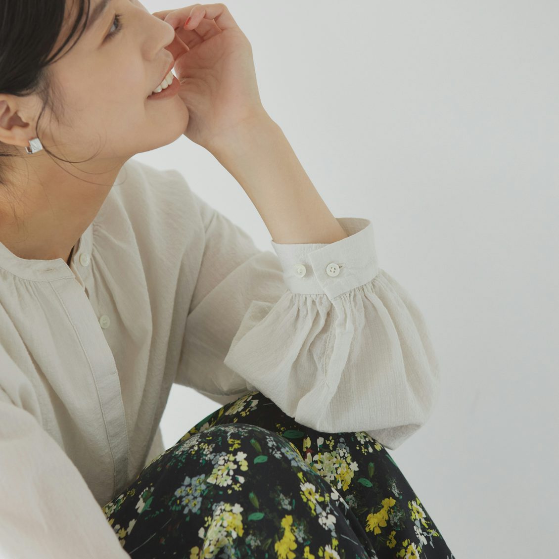 首もとはマニッシュな印象のバンドカラー。キラッと艶のある貝ボタンがそっと華やぎをプラスしてくれます。