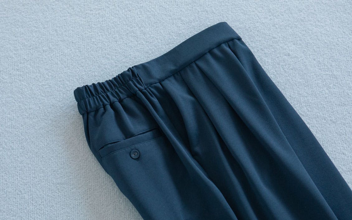 ウエストのデザインは腰回りがきれいに見えて、かつ動きやすさのある2タック。後ろのみゴムになっており、前はすっきり、後ろはゆったりしたはき心地です。