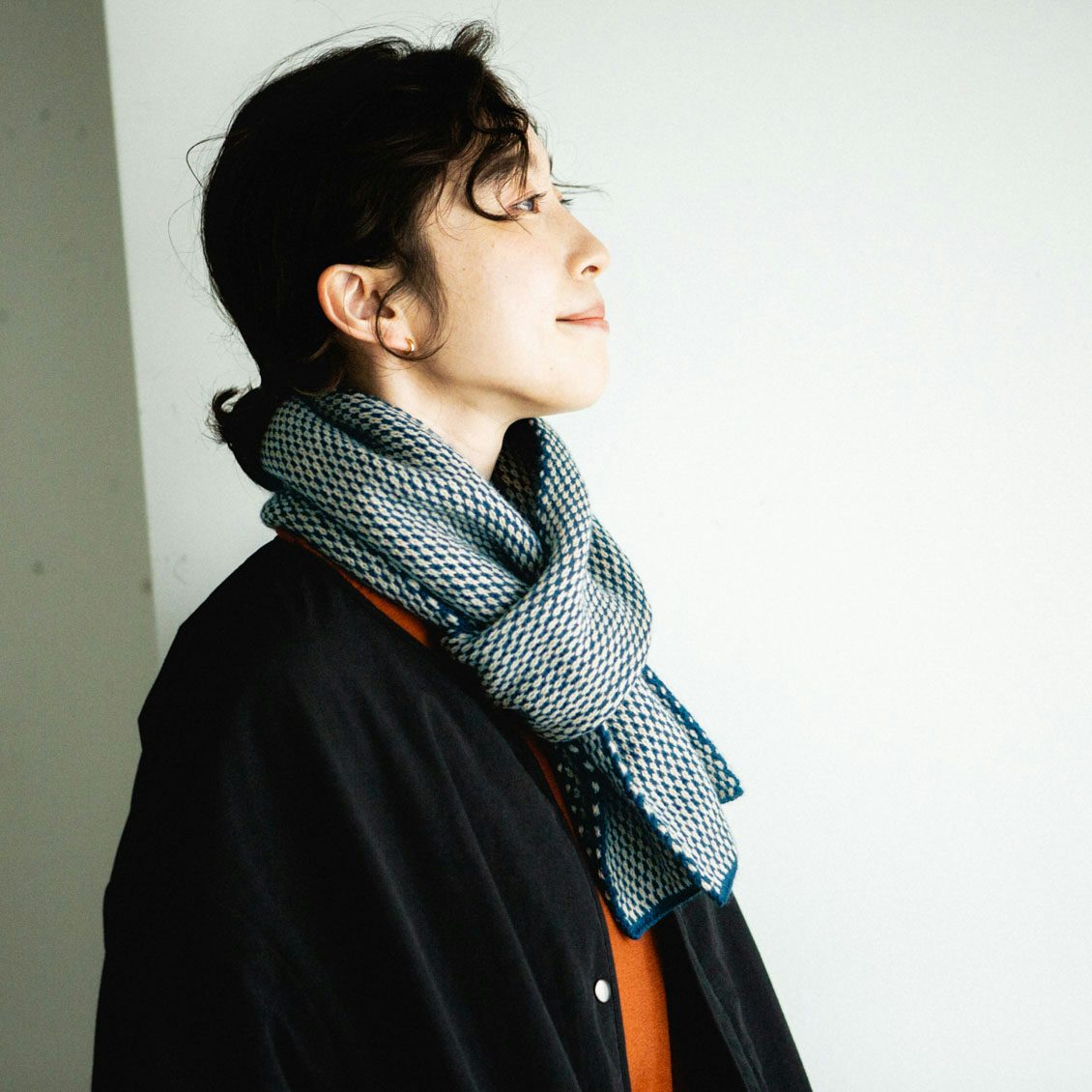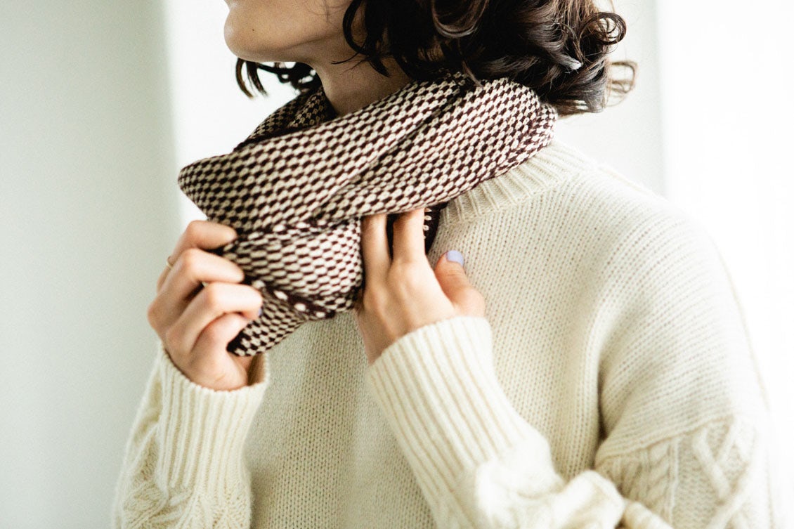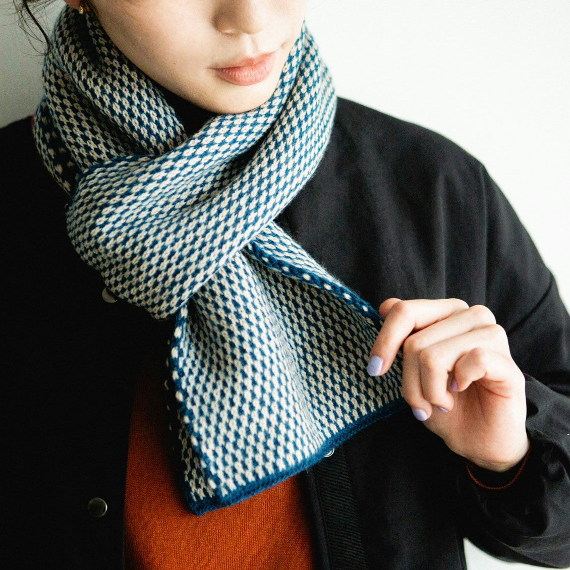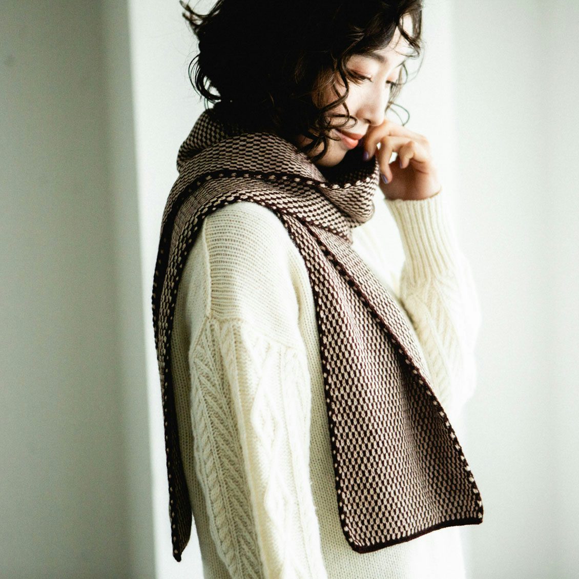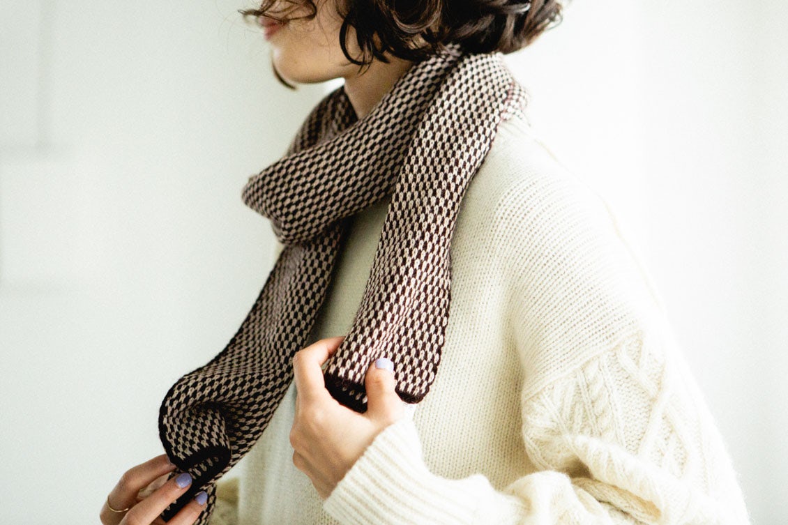 2色の糸を用いた点描のような柄は、ありそうでないデザイン。シンプルで大人っぽいのに、顔まわりが華やぐのがうれしいんです。