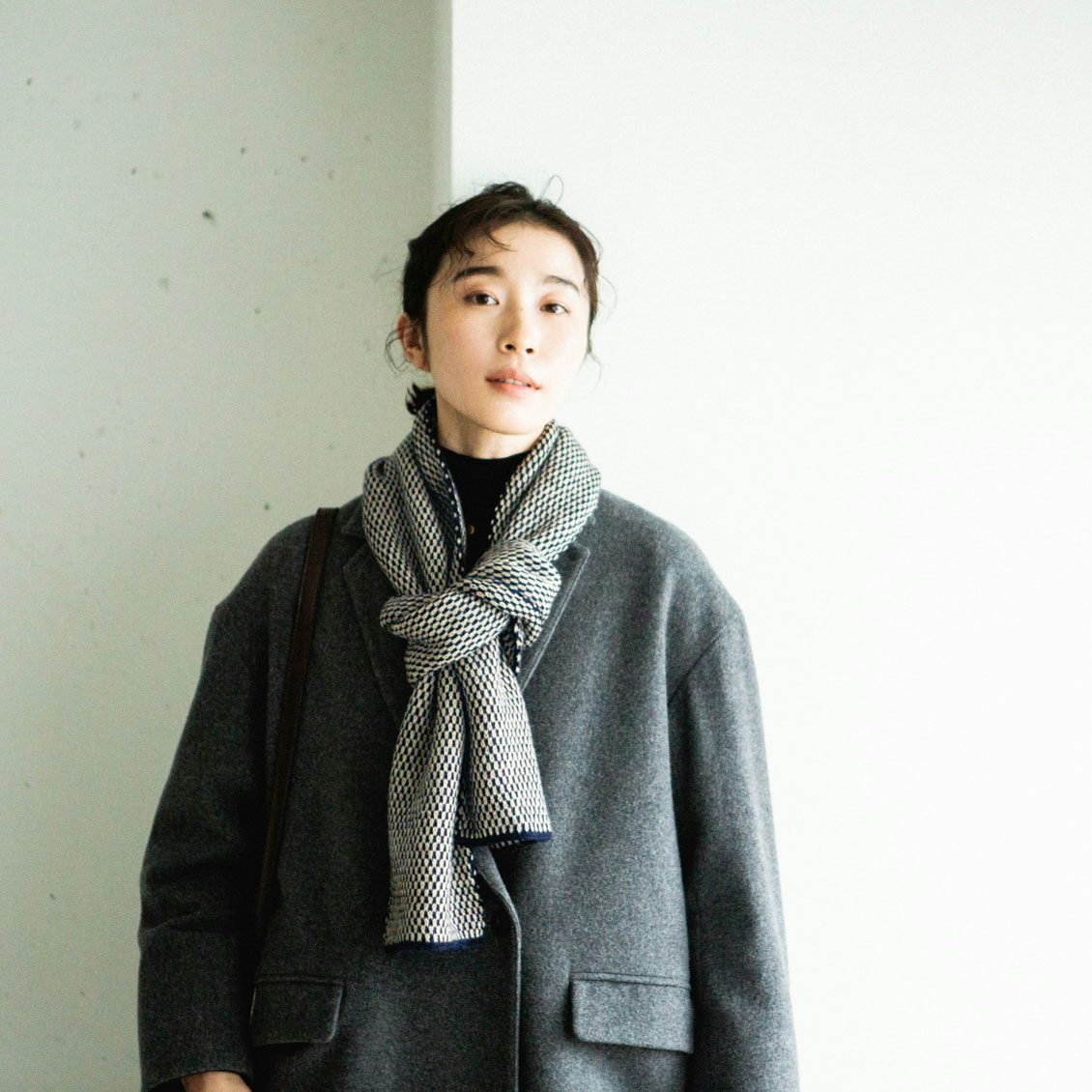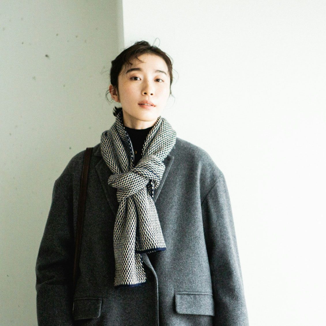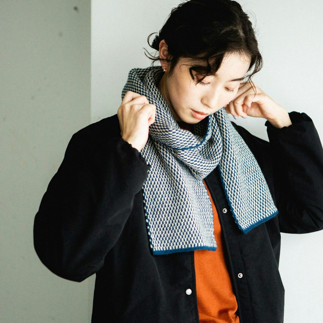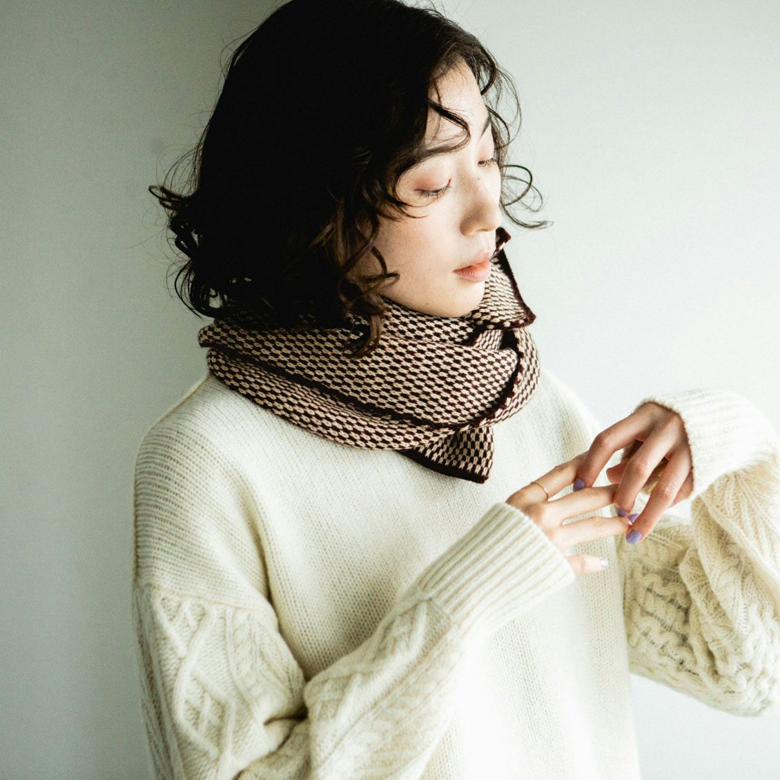 2色の糸を用いた点描のような柄は、ありそうでないデザイン。シンプルで大人っぽいのに、顔まわりが華やぐのがうれしいんです。