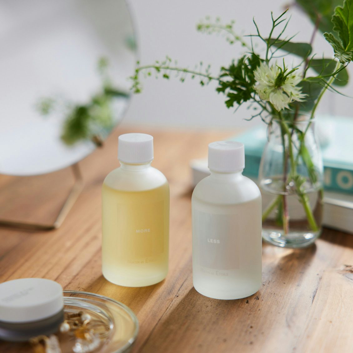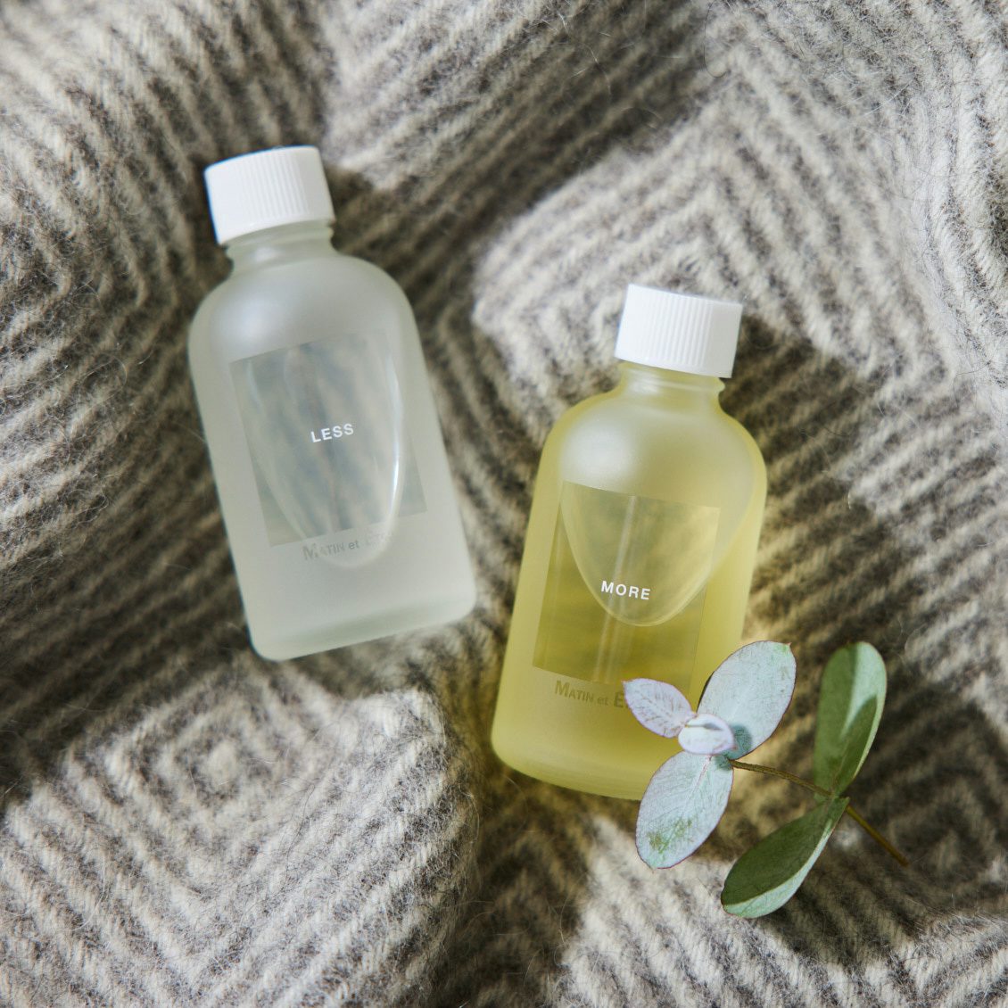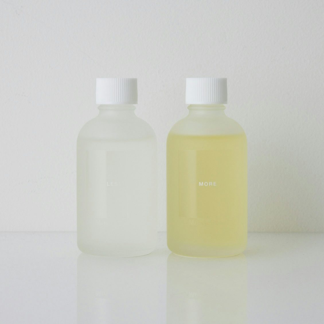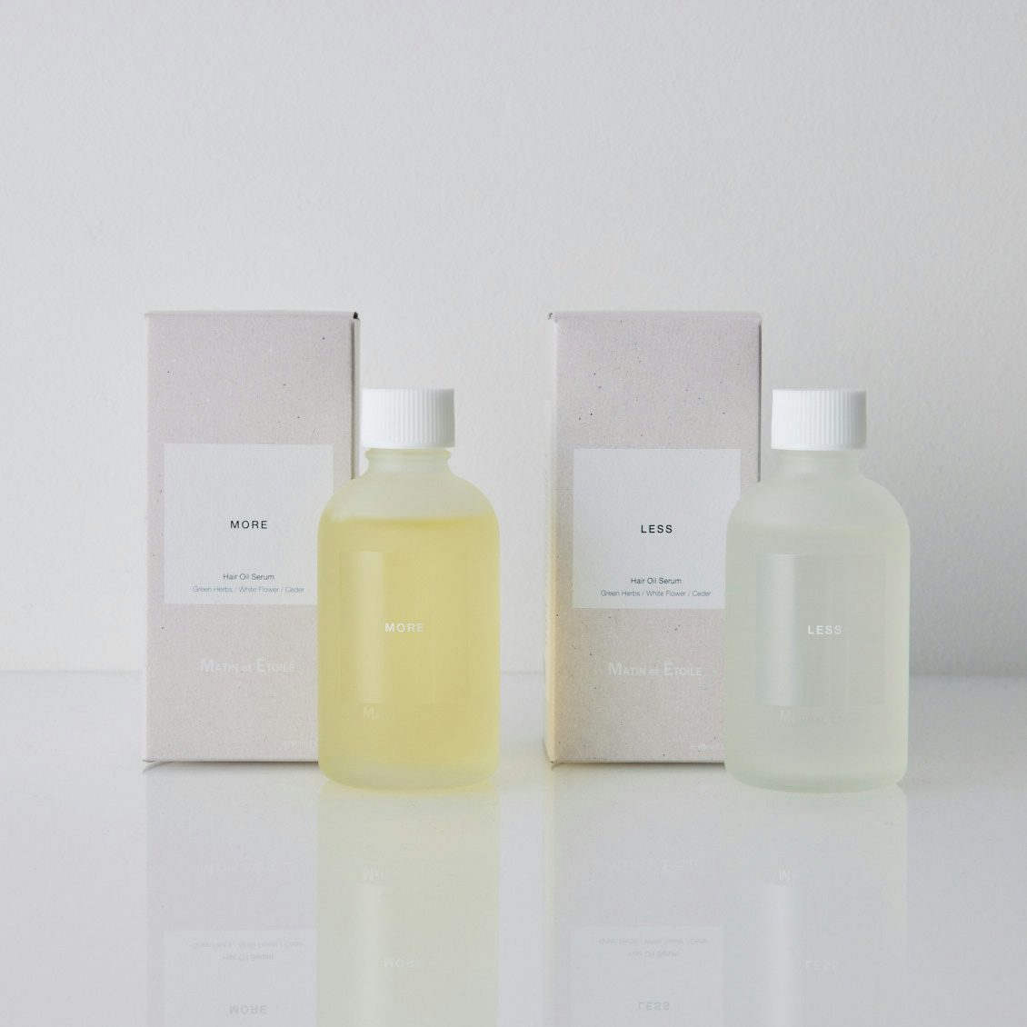 香りはMOREとLESS共通。グリーンハーブ、ホワイトフラワー、シダーをイメージしたアロマティックグリーンの香りです。