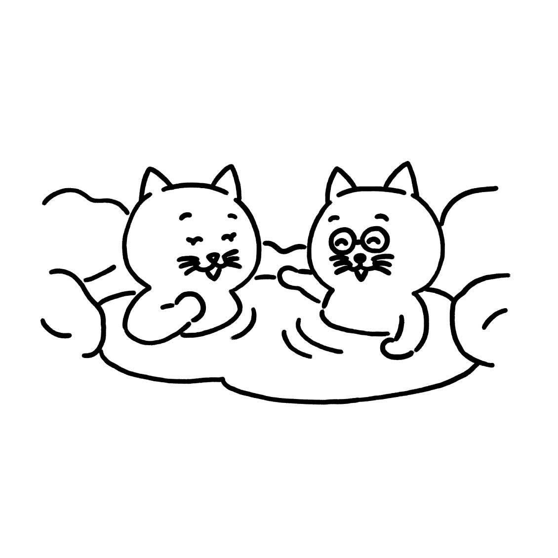 まつ毛をカールしているのが店長ネコ、メガネをかけているのがよしべネコ。2人が温泉に浸かりながら楽しくおしゃべりしている様子をイラストにしました。