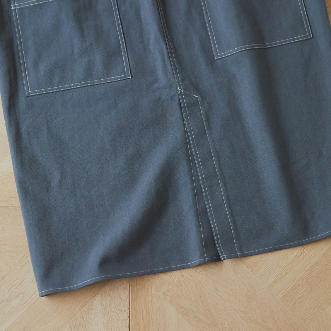 エプロンの一番上にはあえてステッチをいれず、すっきり見えするデザインに。