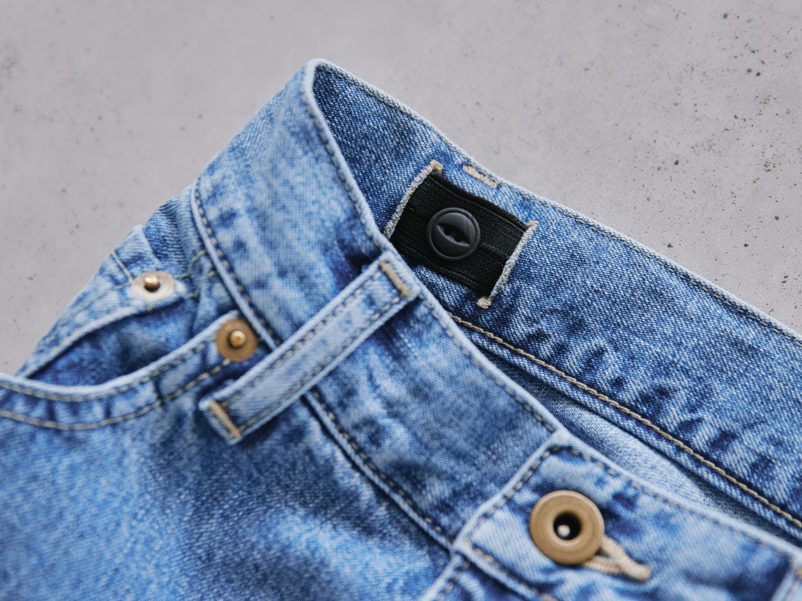 調整はウエストの内側にある「アジャストゴム」を引っ張り、お好きな位置でボタンを留めればOK。好みの着用感にしていただけます。