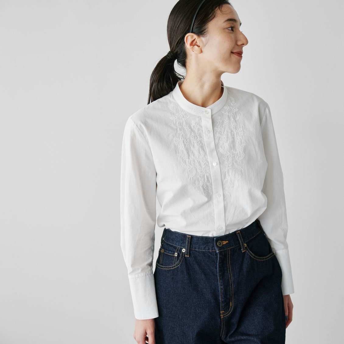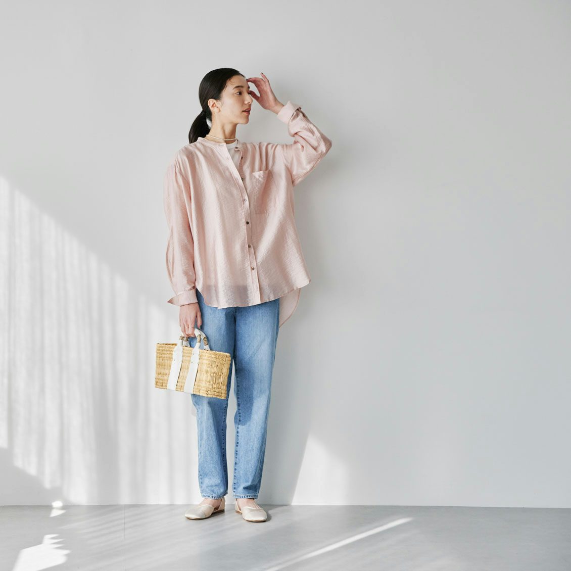 夏が近づいてきたら、シアーなシャツで涼やかに。淡いブルーデニムは色モノのトップスとも優しくなじみます。