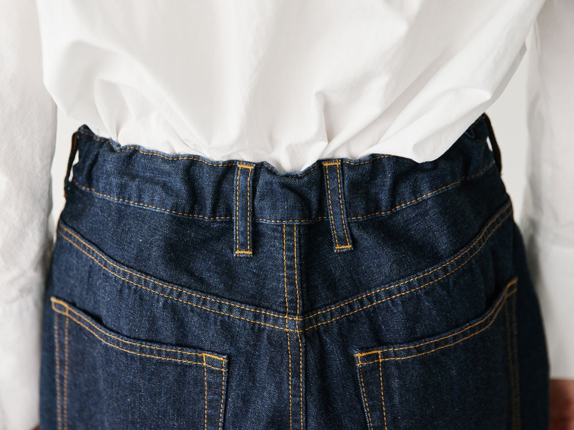 ウエストゴムで伸ばすのではなく、縮めるという手法をとることで、シルエットを崩さずキープできるようにしています。