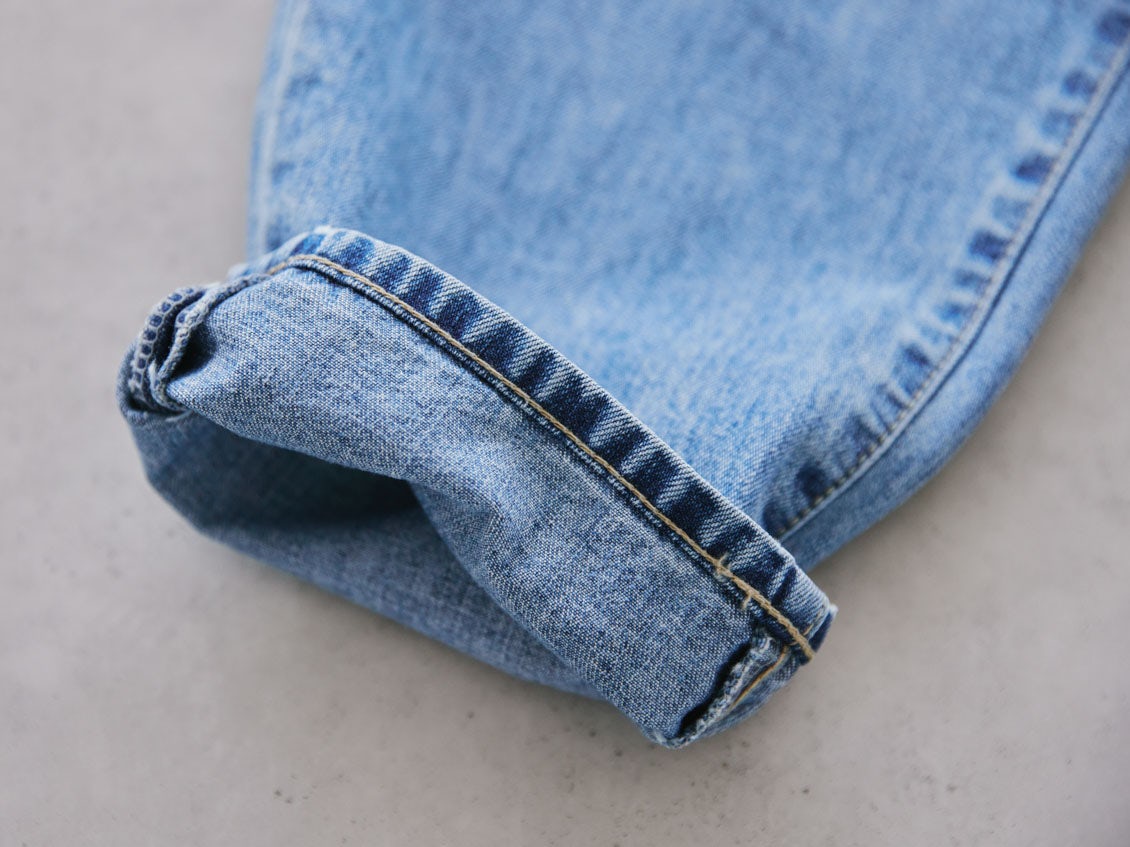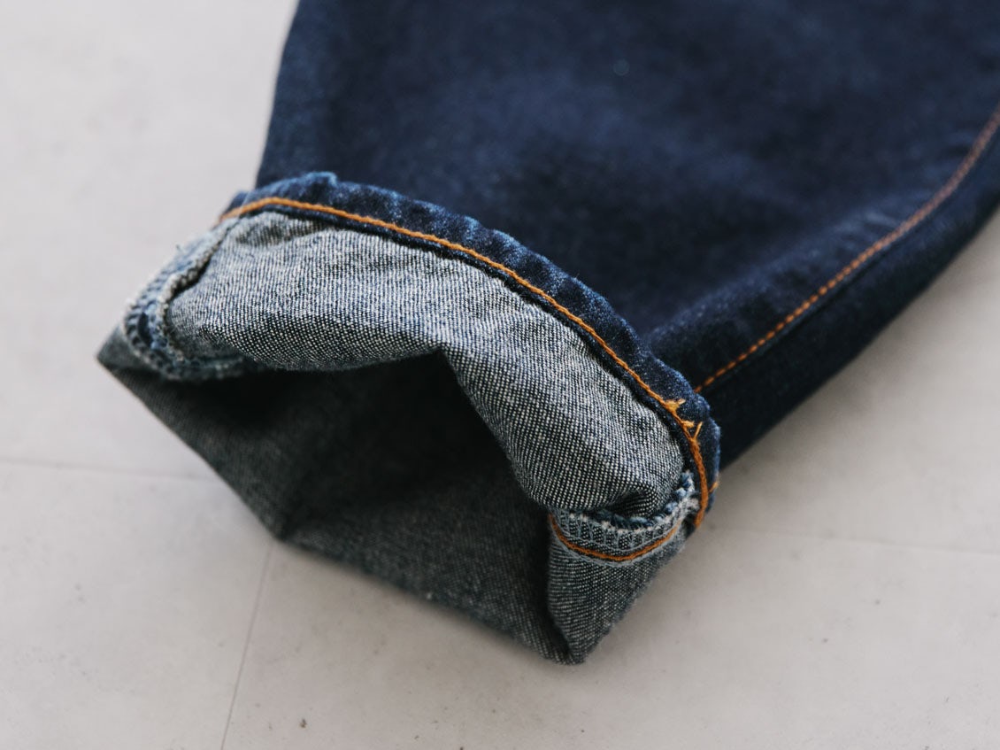 ブルーは独特な風合いや色合いを出すため、特殊な加工を施しています。加工の特性上、裾やポケット口などに小さな生地のほつれが見られる場合があります。
