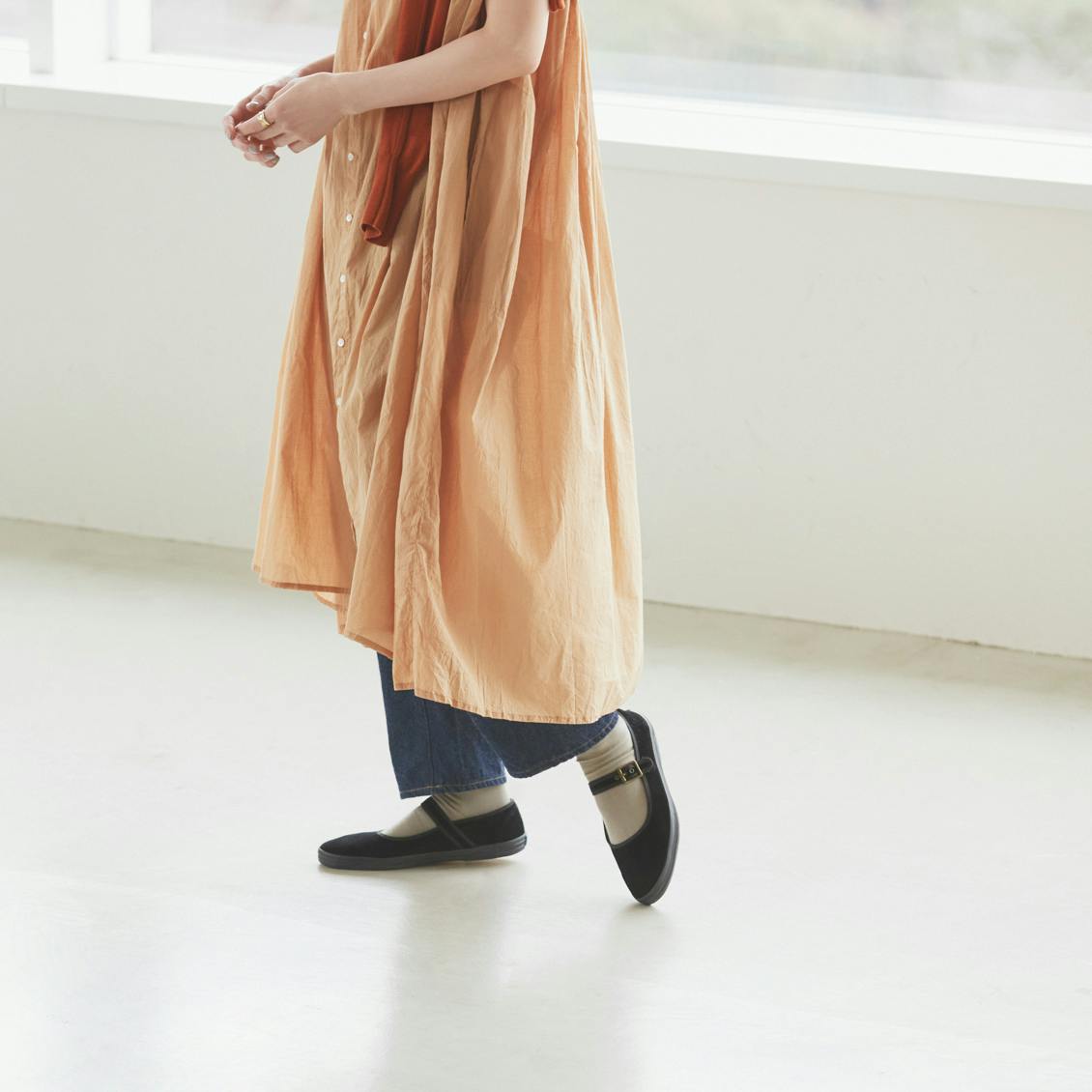 ワンピースやスカートでもバランスを気にせず履ける絶妙な丈。