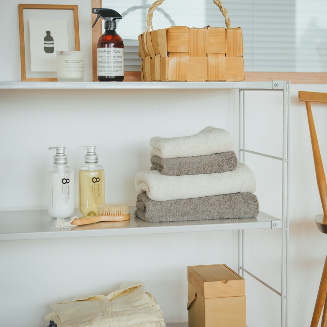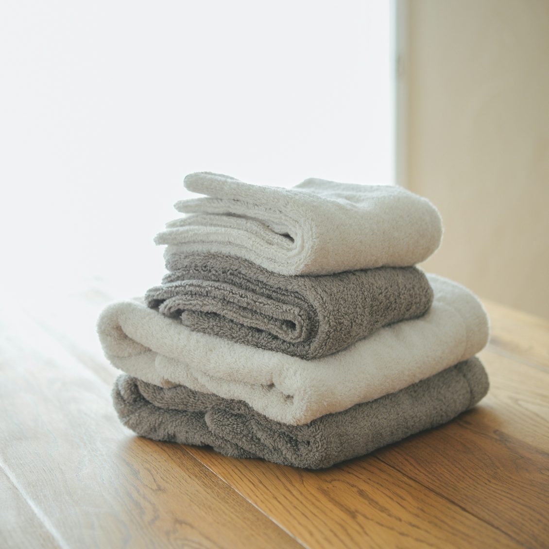 明るく清潔感のあるカラー。真白ではなく、ほんのり色味をつけたことで、タオルを長く使い続けたときのくすみが目立ちにくいようになっています。