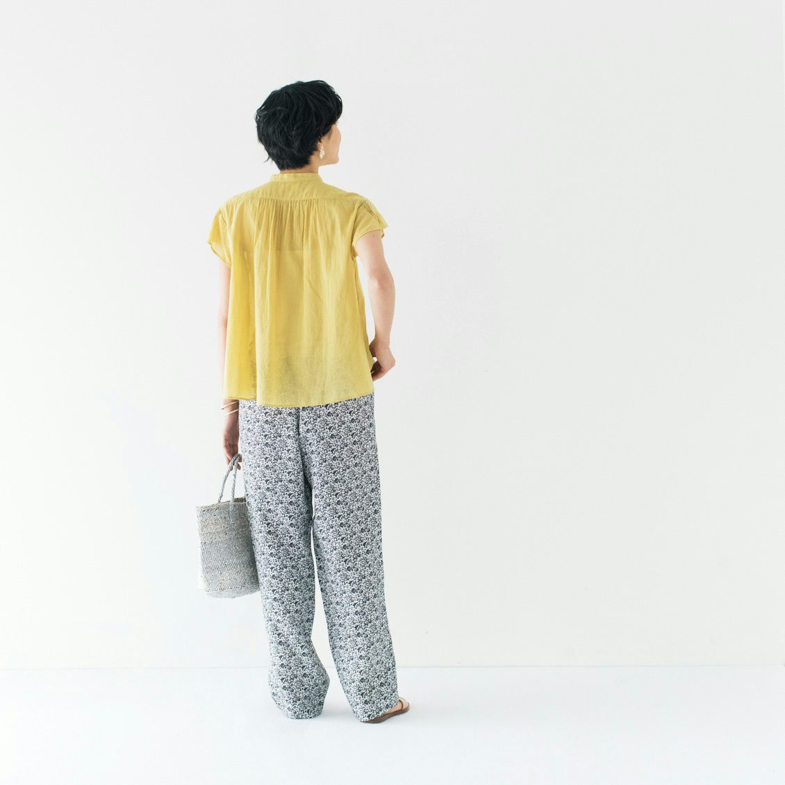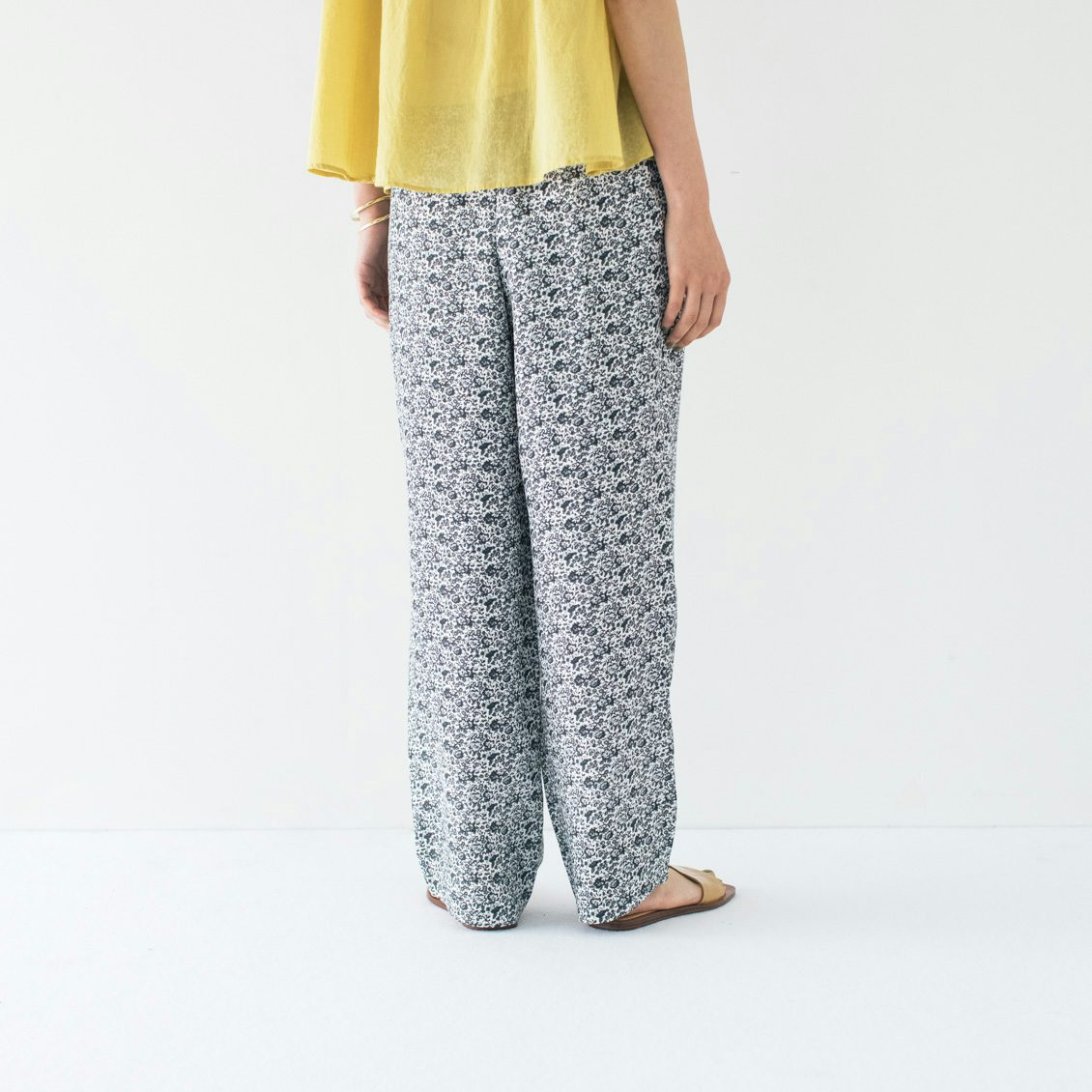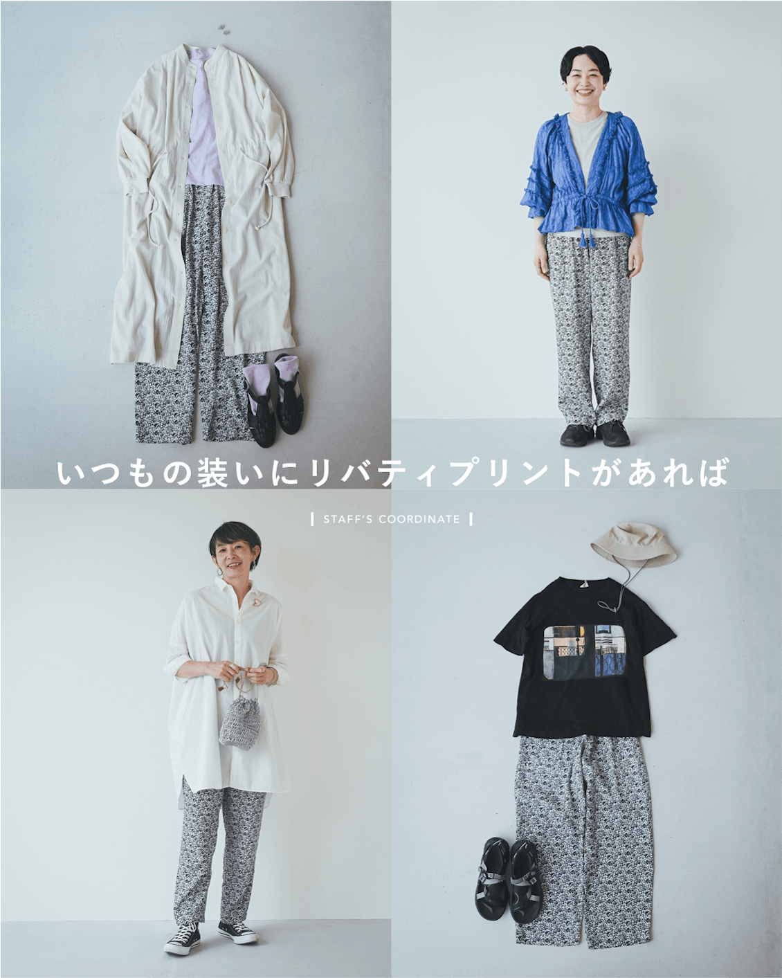 着心地も軽やかで、シワにもなりにくい。そんなリバティプリントのイージーパンツをスタッフが着回しました。