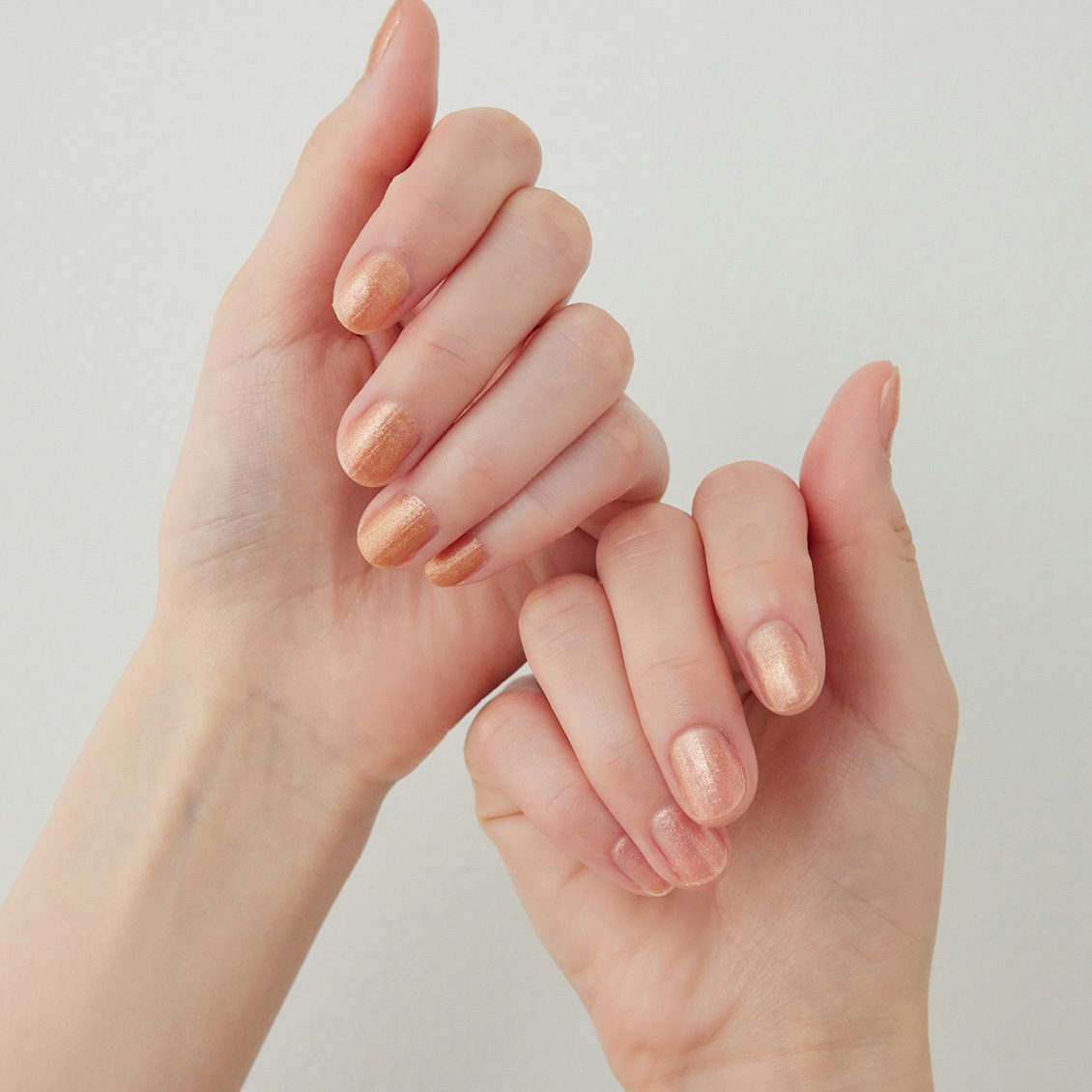 あえてサイズの異なるゴールドとカッパーのラメを配合しているから、ぎらつきは抑えつつ、さっと塗るだけでも存在感は十分。