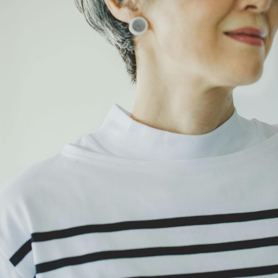 一番の特徴である「モックネック」は、クルーネックより少し高く、ハイネックよりも低い首元のデザインのこと。