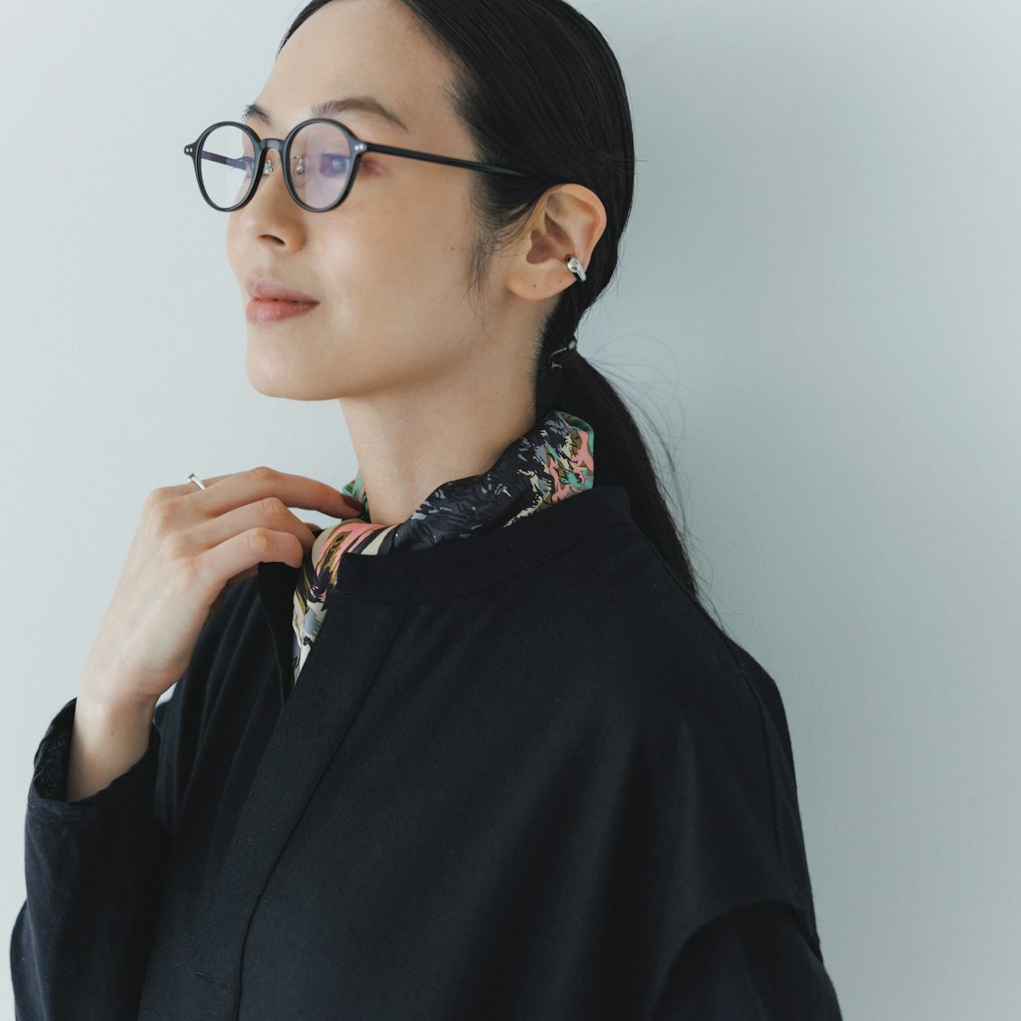 季節によってインナーを変えたり、首元にスカーフやアクセサリーをのぞかせたり。