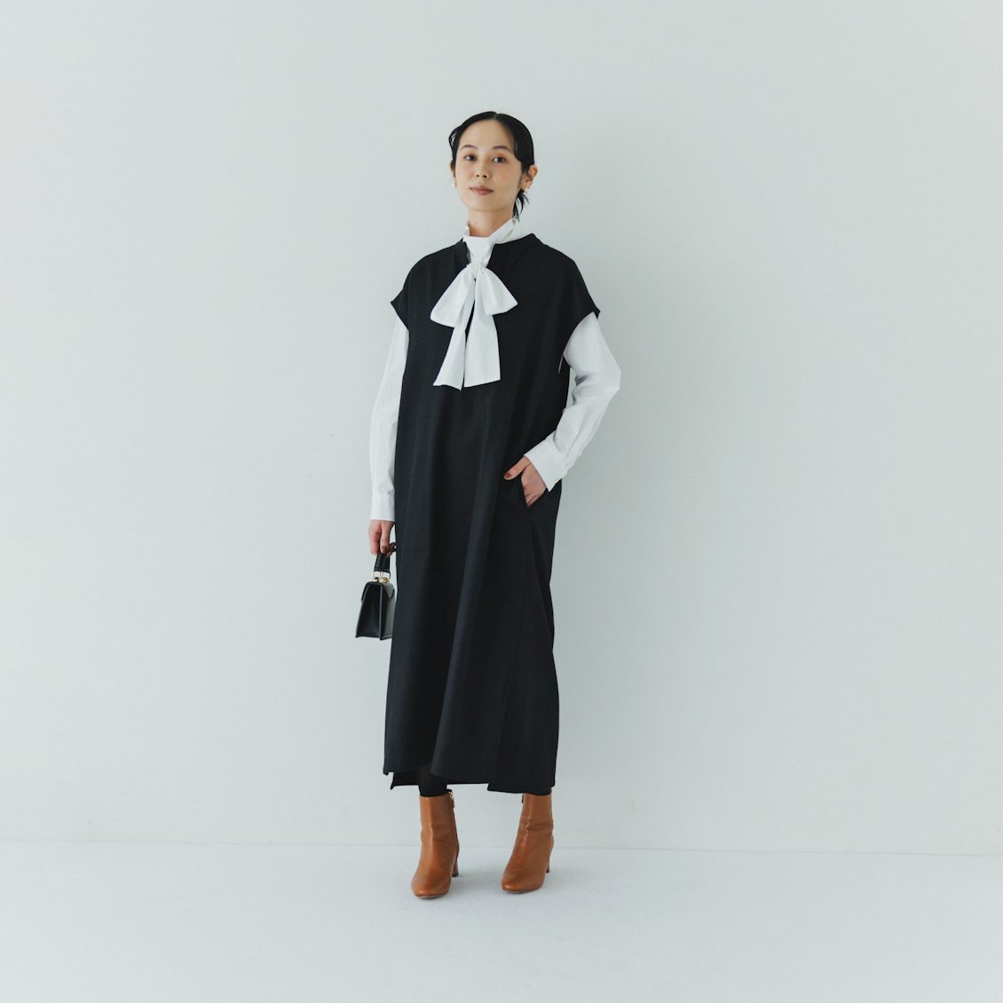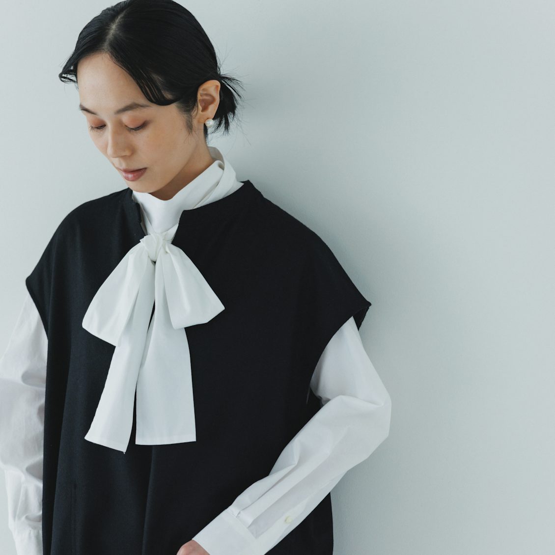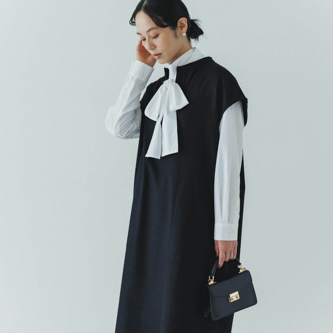 特にブラックは、例えばこんなふうにボウタイブラウスを合わせて、とっておきのお出かけ着としても。