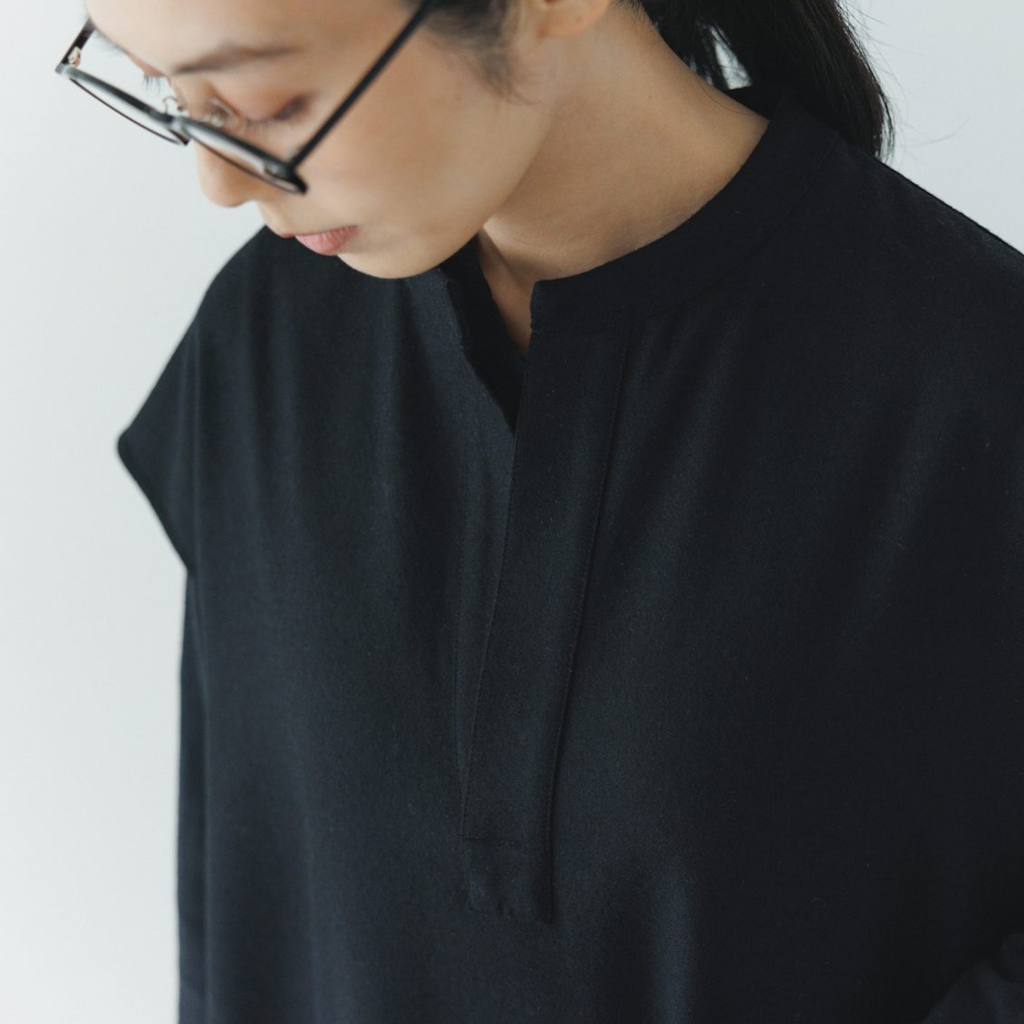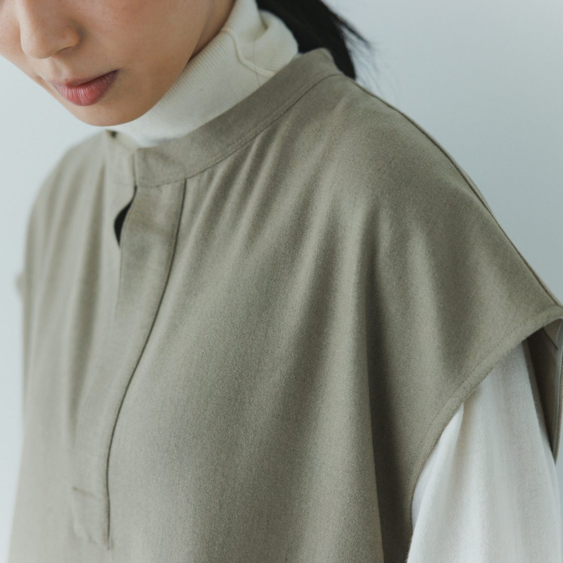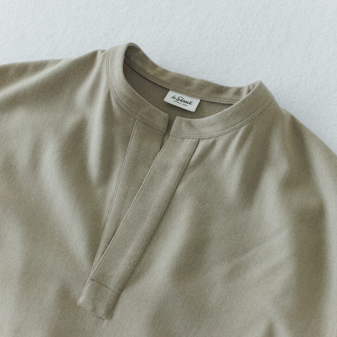 首元はスキッパーネックと呼ばれる、バンドカラー+スリットの入ったデザイン。