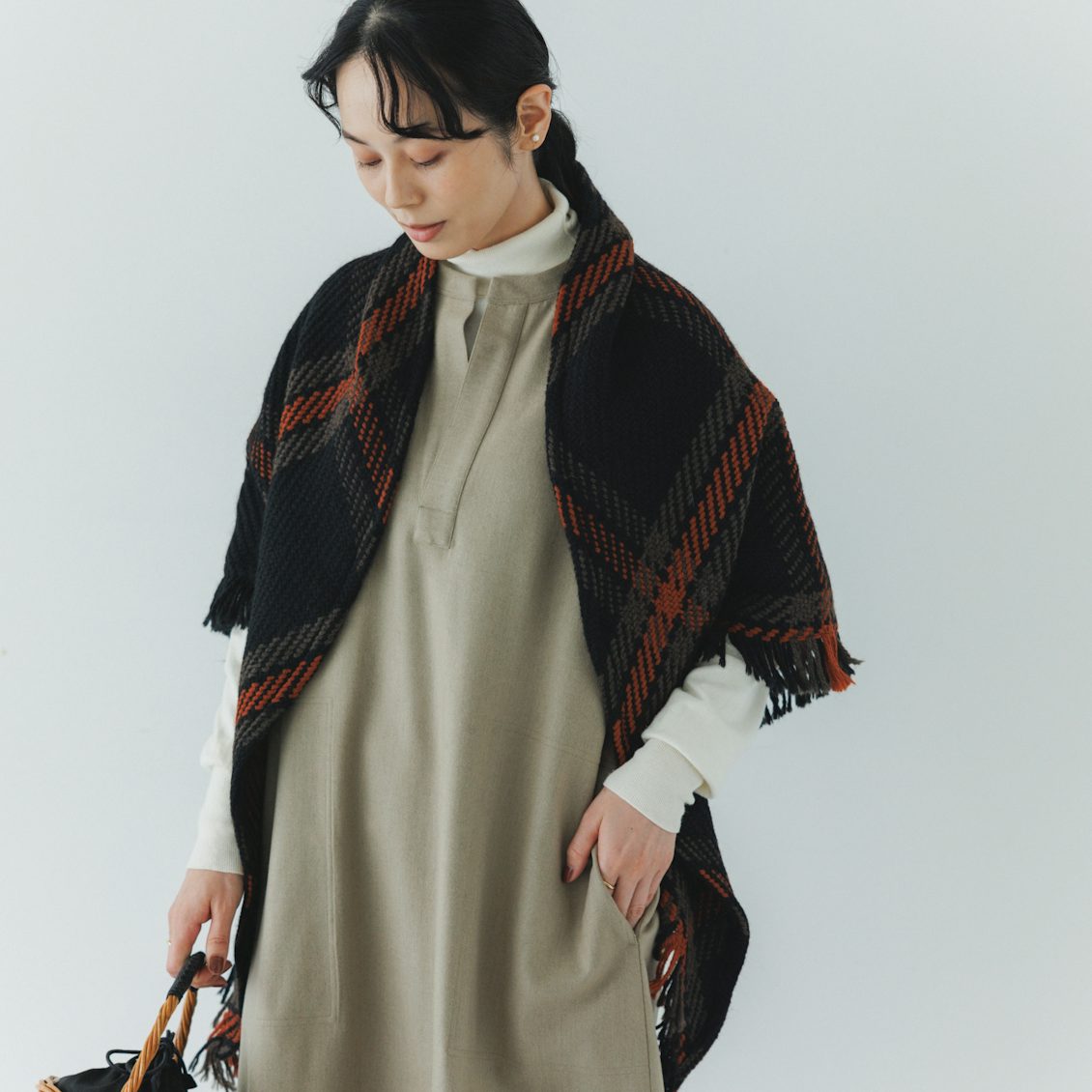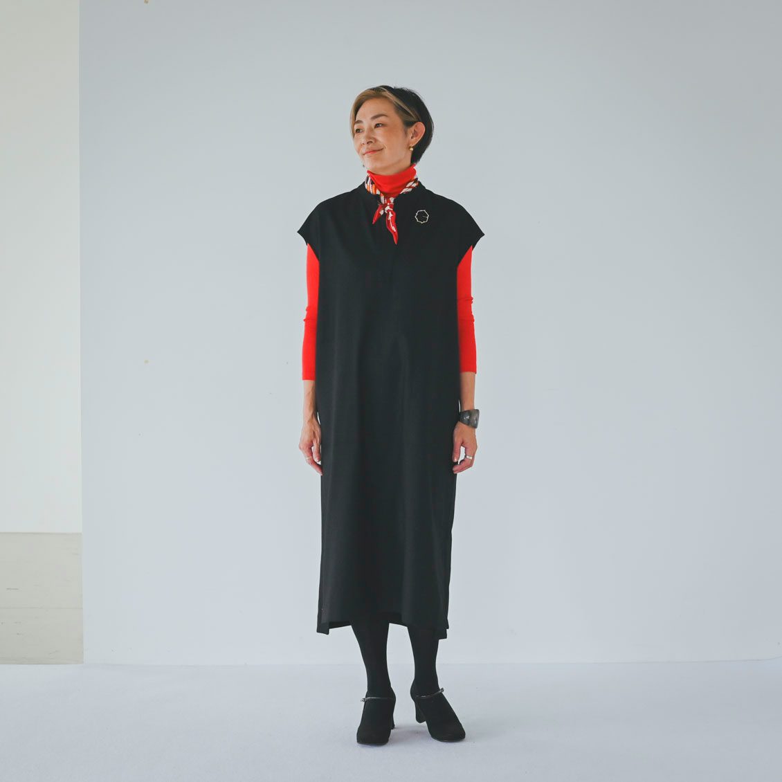 シンプルなデザインなので、バッグやショールなど、ポイントになる小物を取り入れても素敵です。
